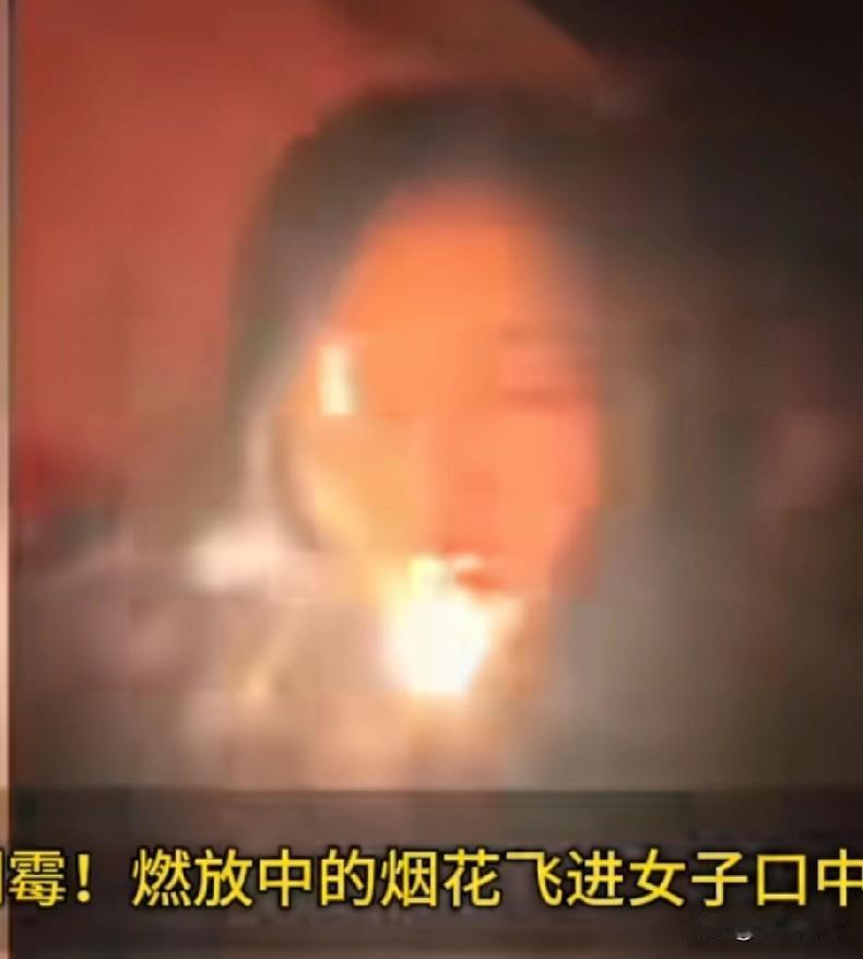 倒霉,燃放的烟花飞进女子口中,想想都后怕,别乱玩了,还好眼睛用手挡住了! 所以说看热闹不要傻乎乎地张着嘴。烟花飞入口中,敢紧对着自来水(冷)降温,高温硝烟烧伤上呼吸道咽喉,后果不堪设想,幸好不是眼睛,不但放烟火危险,看烟花也危险 什么奇巧事都有,有一回我骑着摩托车张着嘴一只蜜蜂就飞到嘴里了,还蜇了舌头一肚子。 以前老人说,宁愿望人吃肉,不准望人劈木,现在又要加多一条,不准望人放烟花炮竹