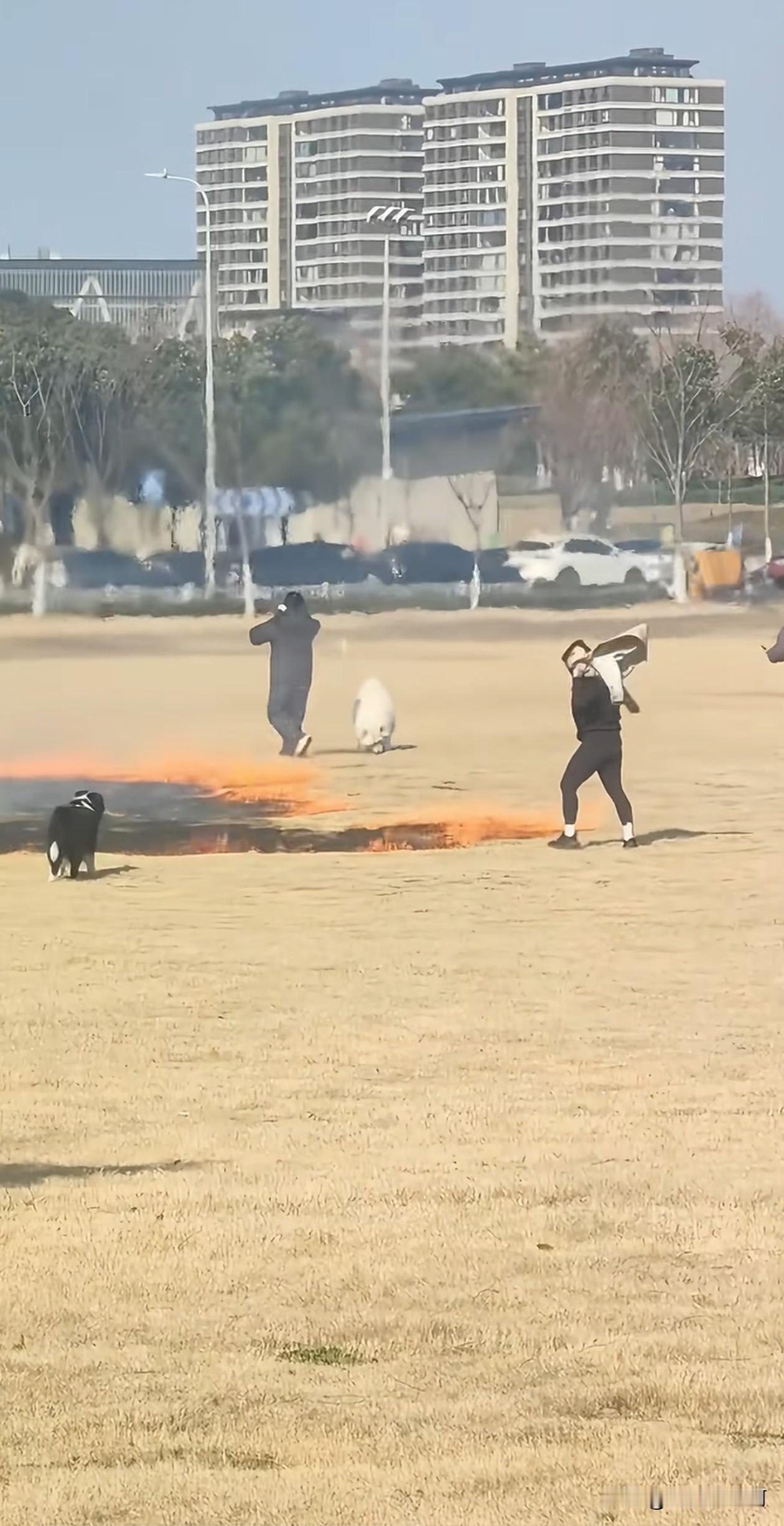 两个小朋友在干枯的草坪上燃放爆竹,不料火星却把草坪点着了,一名正在遛狗的女子匆匆赶过来,也想帮着灭火,火势产生的热浪直逼女子转过身,无法靠近。查询豆包结果是,火最后被灭了,无人员伤亡,但是小朋友的父母需要赔付草坪的损失。