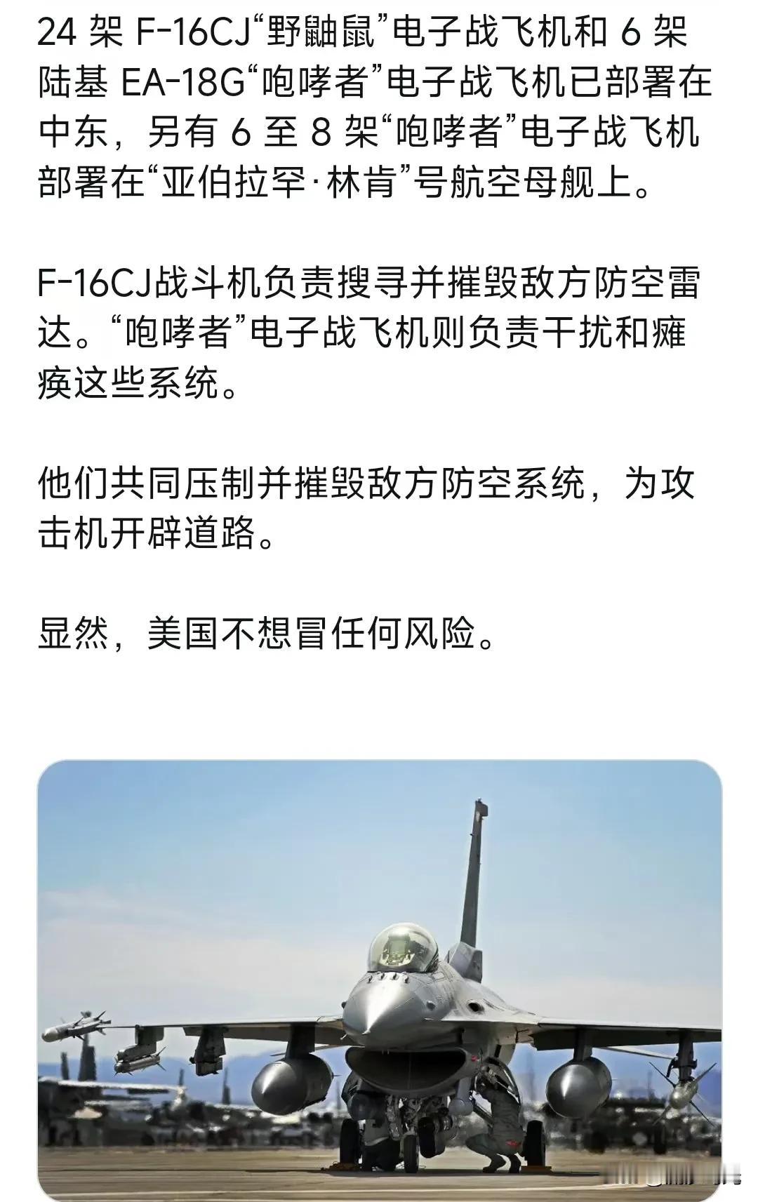 美军在中东地区重要军事部署:24架F-16C、“野鼬鼠”电子战飞机和 6架陆基 EA-18G“咆哮者”电子战飞机已部署在中东,另有6至8 架“咆哮者”电子战飞机部署在“亚伯拉罕·林肯”号航空母舰上。 F-16CJ战斗机负责搜寻并摧毁敌方防空雷达。 “咆哮者”电子战飞机则负责干扰和瘫痪这些系统。美战机中东部署