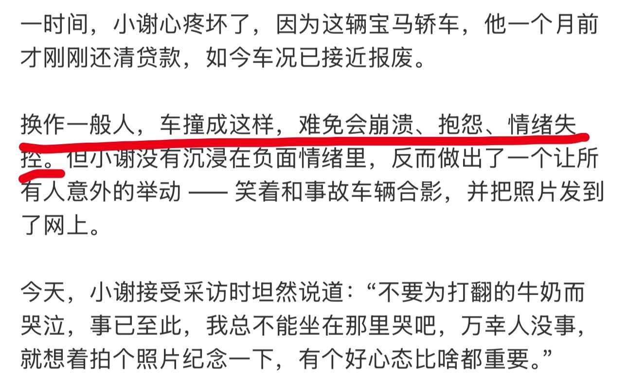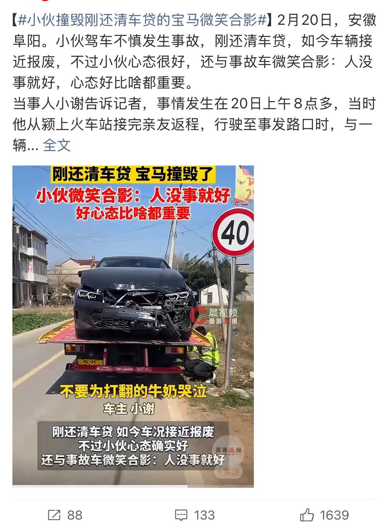 小伙撞毁刚还清车贷的宝马微笑合影不是有保险吗?有什么可崩溃的