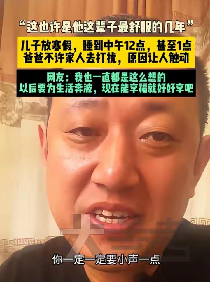 “儿子放假,睡到中午12点,爸爸不许家人去打扰,原因让人感动”! 河北一男孩(可能是大学生),放了寒假一睡睡到大中午,爸爸从不催促,还叮嘱家人说话走路一定一定要小声点,不让任何人去打扰儿子,还把饭菜准备好,等孩子自然醒。 爸爸一句“这可能是他这辈子最舒服的几年”,瞬间让人破防。 学生时代无忧无虑,一旦步入社会,就要面对早出晚归、生活压力,连睡个懒觉都变得奢侈。 不打扰、多包容,不是纵容,而是父母最深的理解和疼爱。这样温柔又通透的教育方式,真的太暖心了。