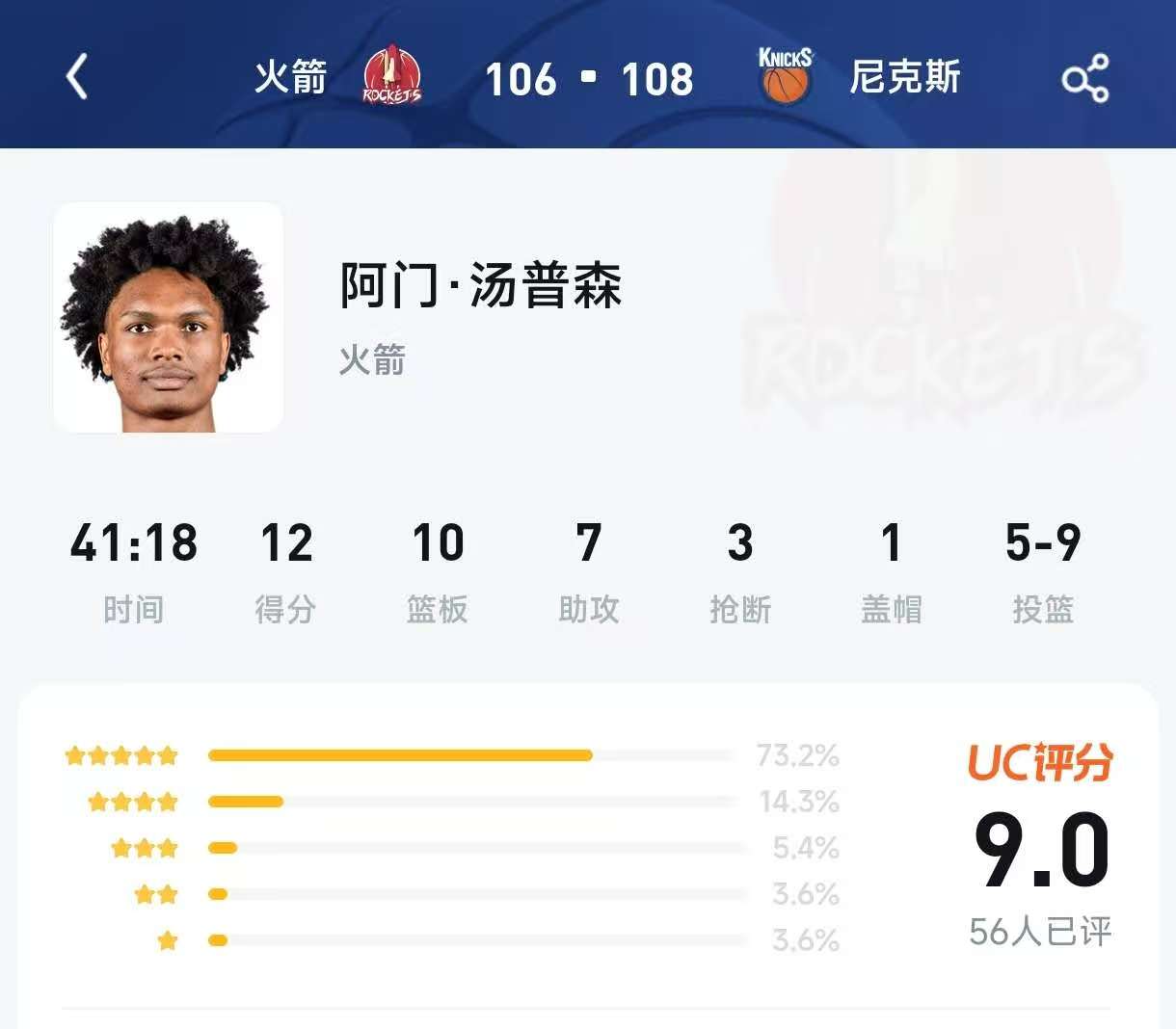 比赛信息:火箭 106 - 108 尼克斯 | 2026.02.22 球员:阿门·汤普森(火箭队) 球员数据:时间 41:18 | 得分 12 | 篮板 10 | 助攻 7 | 抢断 3 | 盖帽 1 | 投篮 5-9 评分分布:5星 73.2% | 4星 14.3% | 3星 5.4% | 2星 3.6% | 1星 3.6% UC评分:9.0 | 评价人数 56人已评