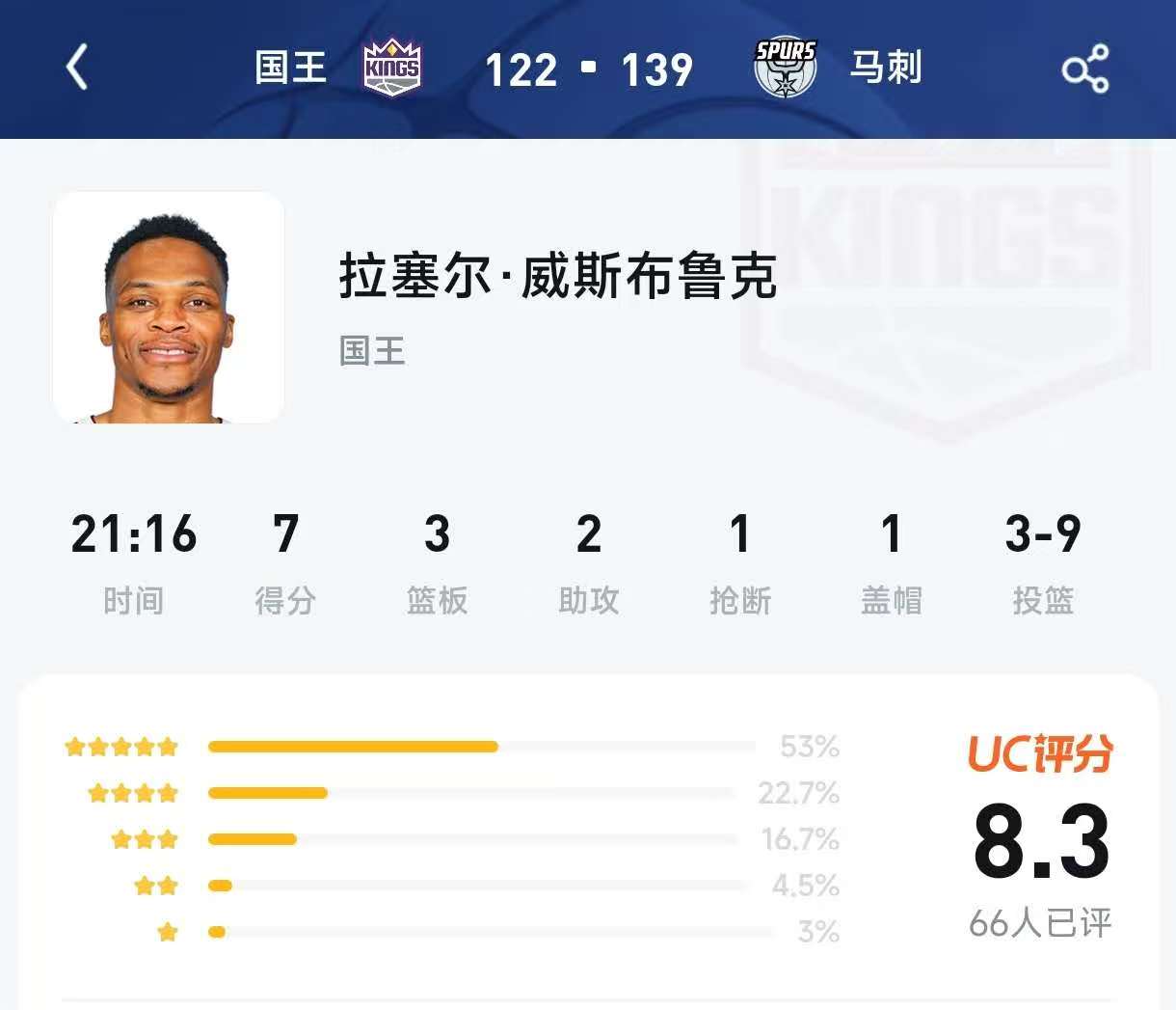 国王 122 - 139 马刺 球员:拉塞尔·威斯布鲁克(国王队) 球员数据:时间 21:16 | 得分 7 | 篮板 3 | 助攻 2 | 抢断 1 | 盖帽 1 | 投篮 3-9 | 失误 5 评分分布:5星 53% | 4星 22.7% | 3星 16.7% | 2星 4.5% | 1星 3% UC评分:8.3 | 评价人数 66人已评