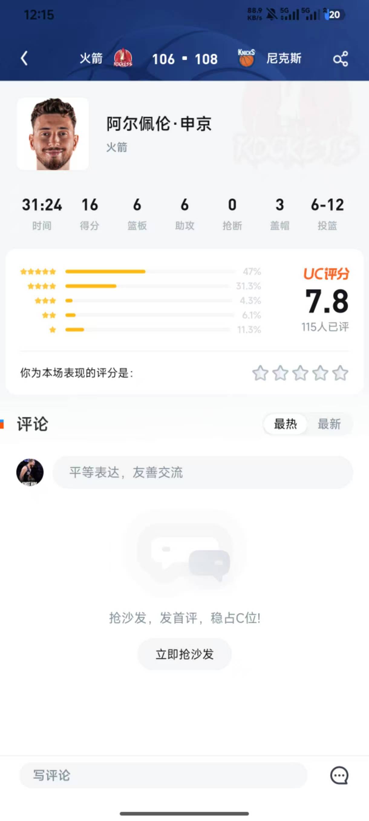 用户“火箭超市何时开业”: 47%的五星是哪里来的?尼克斯球迷点的吗?虽然我投了四星,但说实话,面对唐斯和米罗,申京的篮板卡位还是吃亏啊,6个篮板对核心中锋来说少了点。不过那3个盖帽是真提气,特别是冒布伦森那个!申京:我 Datuak 拉满,但篮板嗅觉有时候掉线。