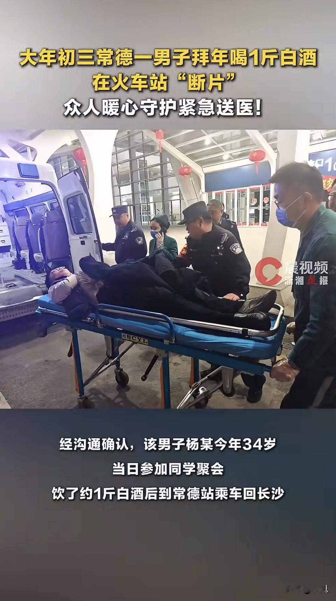 你敢信?大年初三深夜,常德火车站候车室,一个男人瘫在座椅上,旁边的人以为他睡着了。可工作人员喊了半天,他一点反应都没有。 这不是睡着了,这是喝了一斤白酒后,人直接“断片”了。监控画面里,他就那么瘫着,浑身酒气,对周围的嘈杂完全没知觉。据光明网报道,这事发生在2月19日晚上十点半左右,常德站派出所接到通报,说1A检票口有个男人不对劲。 民警周秋文赶到现场,一看就紧张起来。深夜的候车室,气温低,醉酒的人最容易出事——呕吐物堵住气管,几分钟人就没了。可这个男人孤零零一个人,身边只有一部手机。 民警喊他,没反应;拍他,还是没反应。整个人就像失去了知觉,瘫在座椅上。这种情况下,谁都不敢轻易动他,怕一个不小心,反而加重危险。 周秋文一边打120,一边翻开他的手机找联系人。电话打通了,那头是家属,一听情况就慌了。原来这男人姓杨,34岁,当天参加同学聚会,一时高兴喝了大约一斤白酒。喝完不去醒酒,反而跑来坐火车,要回长沙。 问题来了——他那些一起喝酒的同学呢?一斤白酒下肚,人已经喝成这样,居然没人送他去车站,更没人通知他家里人。聚会散场,各回各家,把一个醉得不省人事的人扔给了深夜的火车站。 民警不敢松懈。等待救护车的十多分钟里,他一直盯着杨某的呼吸,小心翼翼把他扶成侧坐的姿势,防止呕吐物堵住气管。深夜的寒气从四面八方钻进来,民警脱下衣服给他盖上。这十几分钟,每一秒都像在跟时间赛跑。 晚上十一点二十五分,120救护车赶到。民警和车站工作人员一起,把杨某抬上车,送往常德市第一医院。直到救护车消失在夜色里,他们才松了一口气。 这事让人细思极恐。一斤白酒啊,那不是闹着玩的。如果没人发现他,如果他一个人倒在候车室呕吐窒息,这个年,他家人怎么过?那些酒桌上喊着“兄弟情深”的人,会不会有一丝愧疚? 你遇到过这种情况吗?朋友喝醉了,你是送他回家,还是让他自己走?如果你是那个同学,你会怎么办?评论区聊聊。