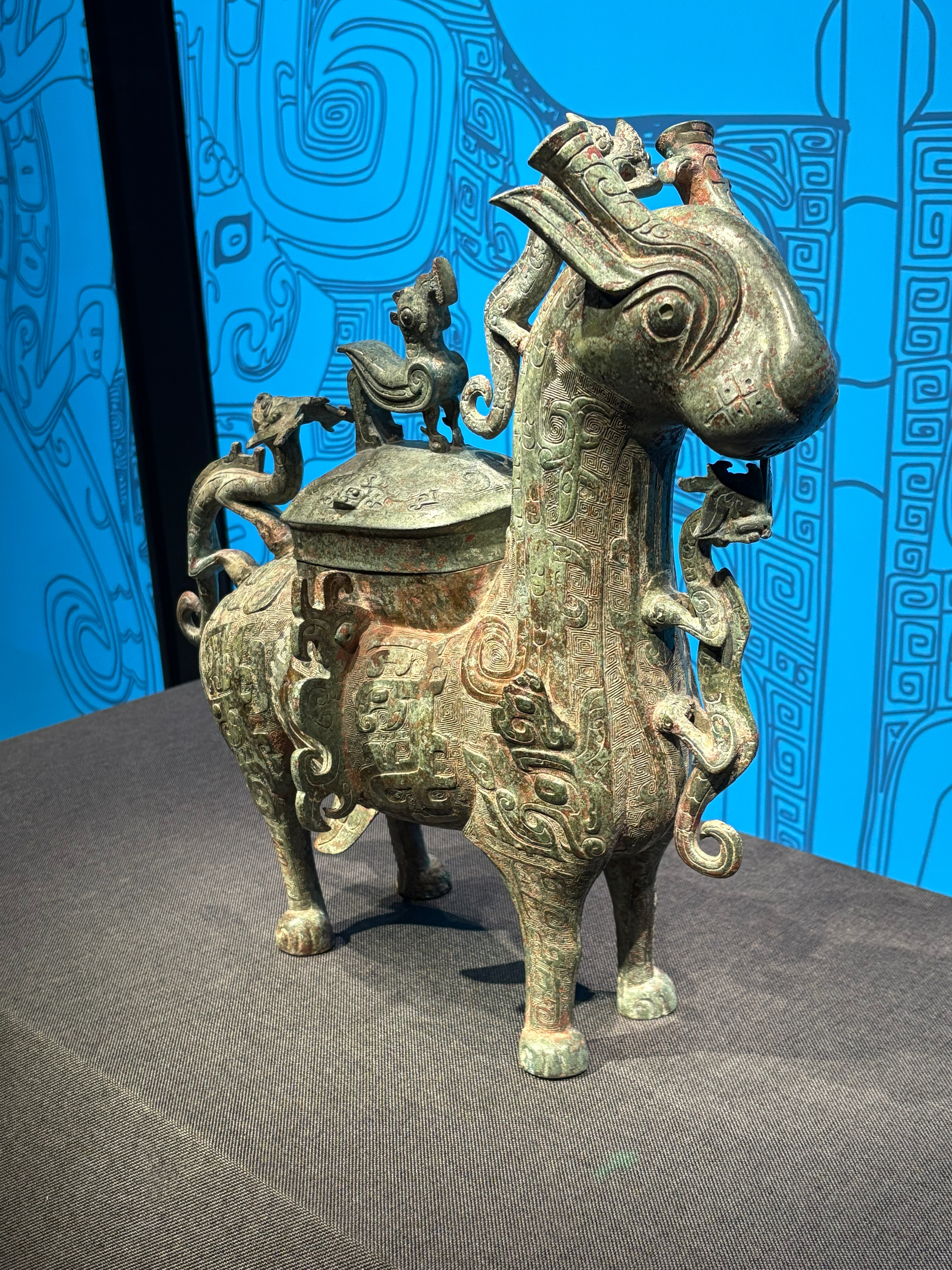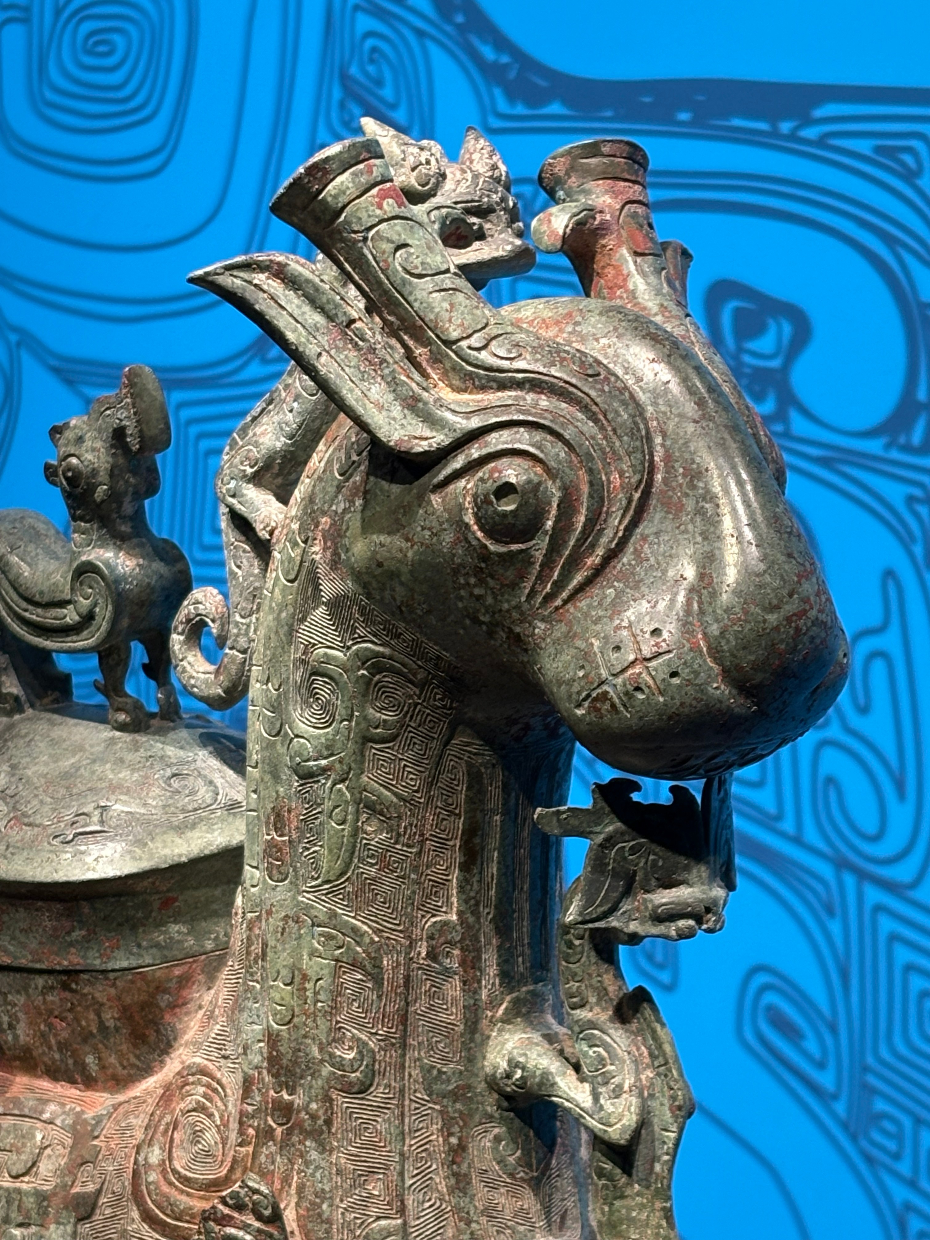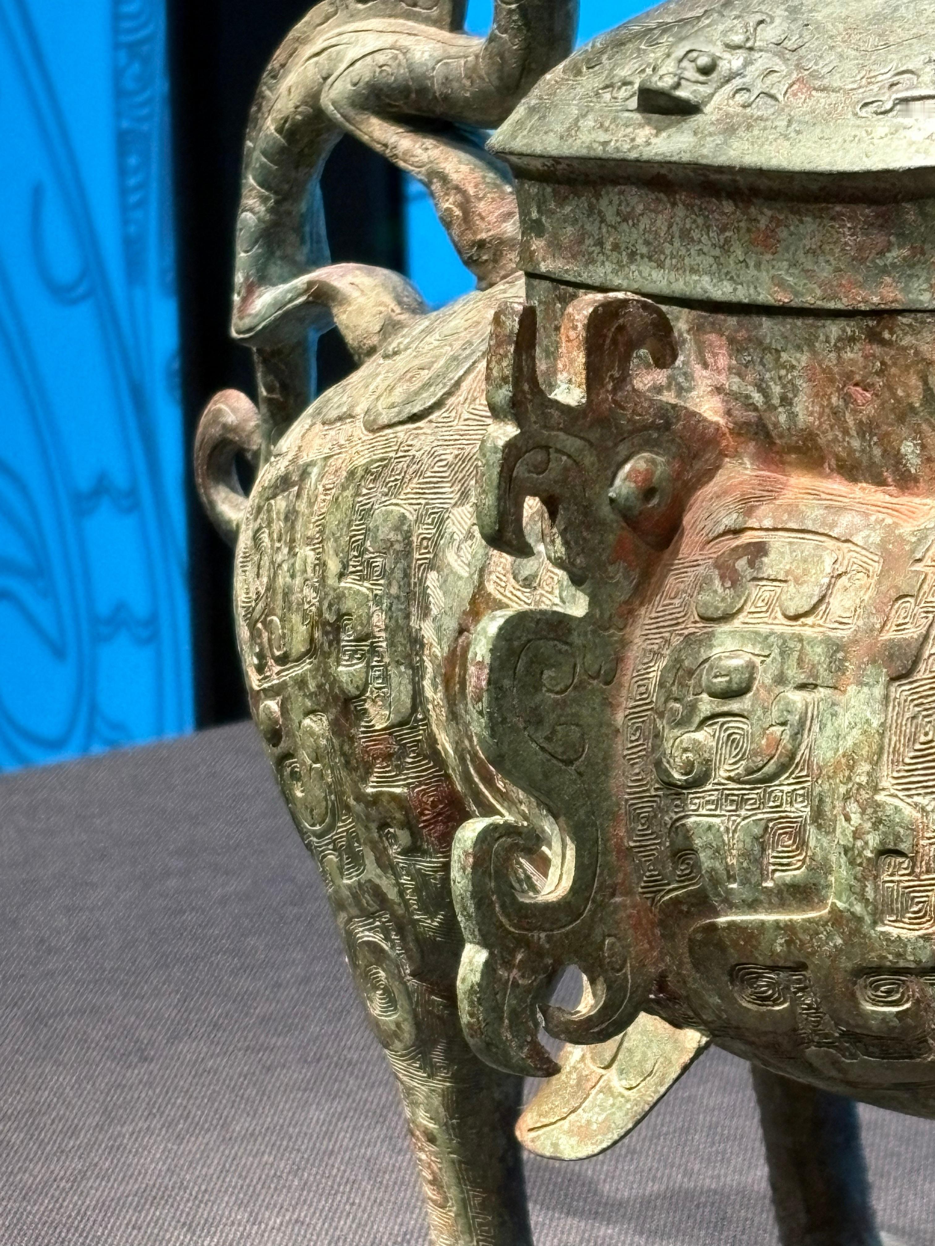 中国考古博物馆收藏的1984年陕西西安市长安区沣河西岸张家坡村出土西周:邓仲牺尊. 几个细节, 神兽肋下生翼, 腿上也有小尖突. 前腿前有高浮雕的兽面,还应该有立体的龙, 可惜有残. 腹部有侧面突出的立鸟扉棱.