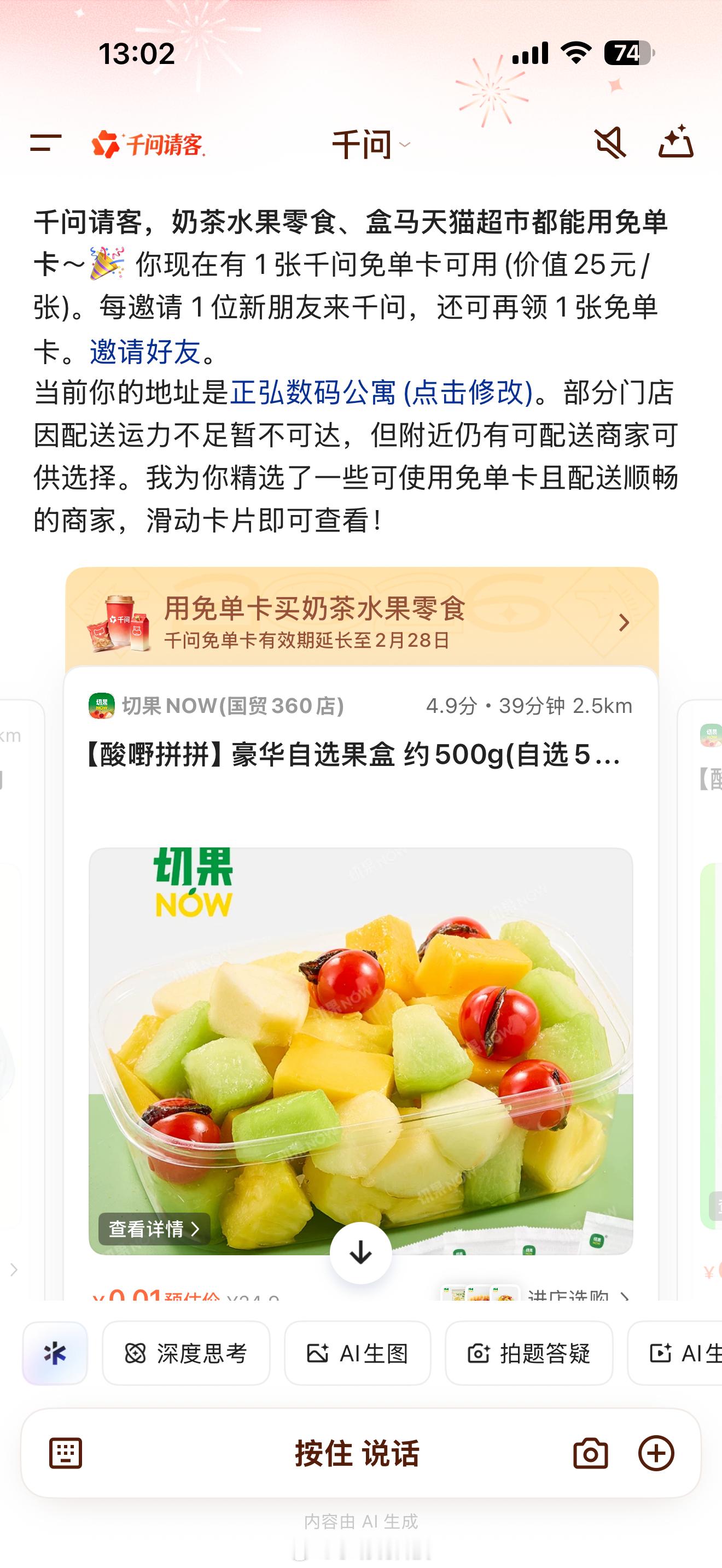 今年春节千问真的太火了,身边好多人都在用,我自己也天天离不开。不光是查资料、写文案帮我大忙,日常消费更方便。用免单卡就能买电影票、景点门票、订机票酒店,点外卖、逛百货、吃吃喝喝也都能用,一句话就能搞定,省心又省钱。不管是出门玩还是宅家,千问都把生活安排得明明白白,效率直接拉满,这段时间我是越用越顺手。