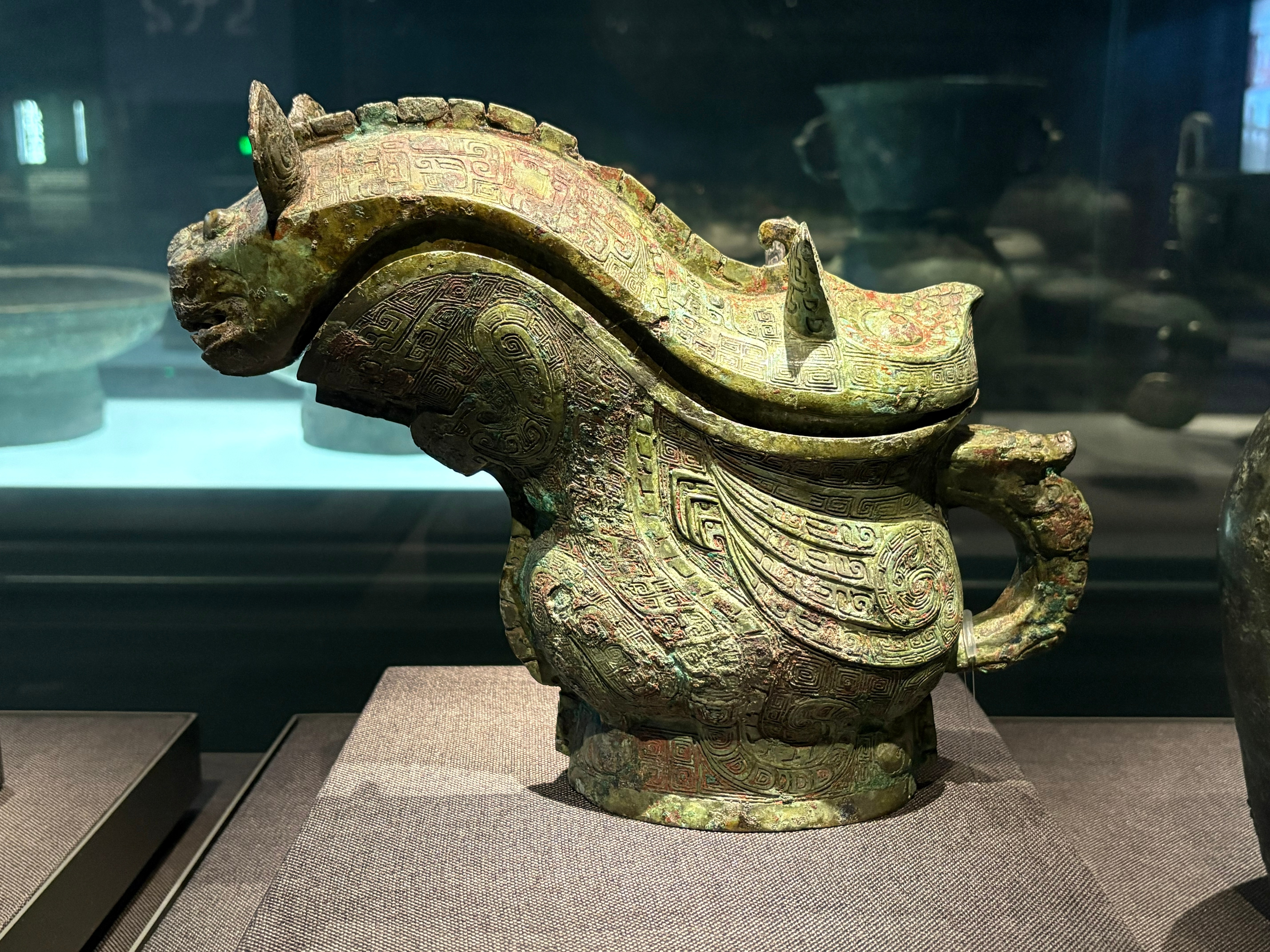 中国考古博物馆藏安阳殷墟西区M1713出土的商晚期兽首盖铜爵. 这类铜爵非常少见