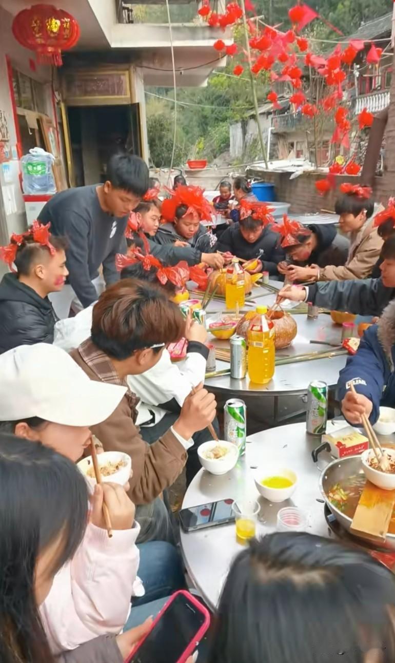 这种酒席实在吃不了,笑点低不仅会笑不停,这筷子也玩不转,怕戳别人眼睛上 这不是姑娘有特殊待遇,而是用长筷子戴头花的男人们待遇特殊!头上戴的是花?真像塑料袋子!不懂就问,这个头花是怎么搞上去的。大筷子,快子,筷子,快生儿子。碗是柚子皮,挺好玩,吃饱还是饿肚子全凭本事。