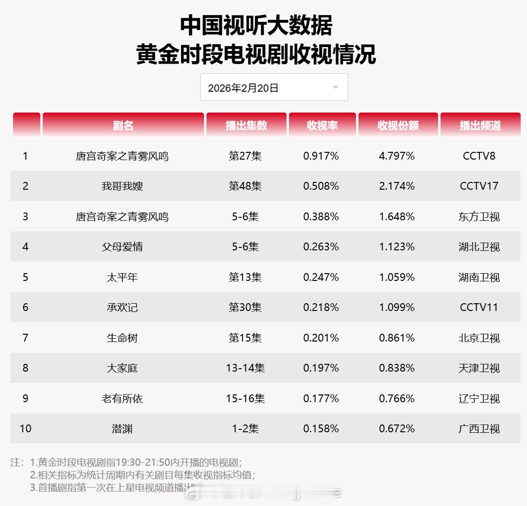 2026年2月20日中国视听大数据CVB黄金档电视剧收视率日榜TOP101 唐宫奇案之青雾风鸣 CCTV82 我哥我嫂 CCTV173 唐宫奇案之青雾风鸣 东方卫视4 父母爱情 湖北卫视5 太平年 湖南卫视6 承欢记 CCTV117 生命树 北京卫视8 大家庭 天津卫视9 老有所依 辽宁卫视10 潜渊 广西卫视