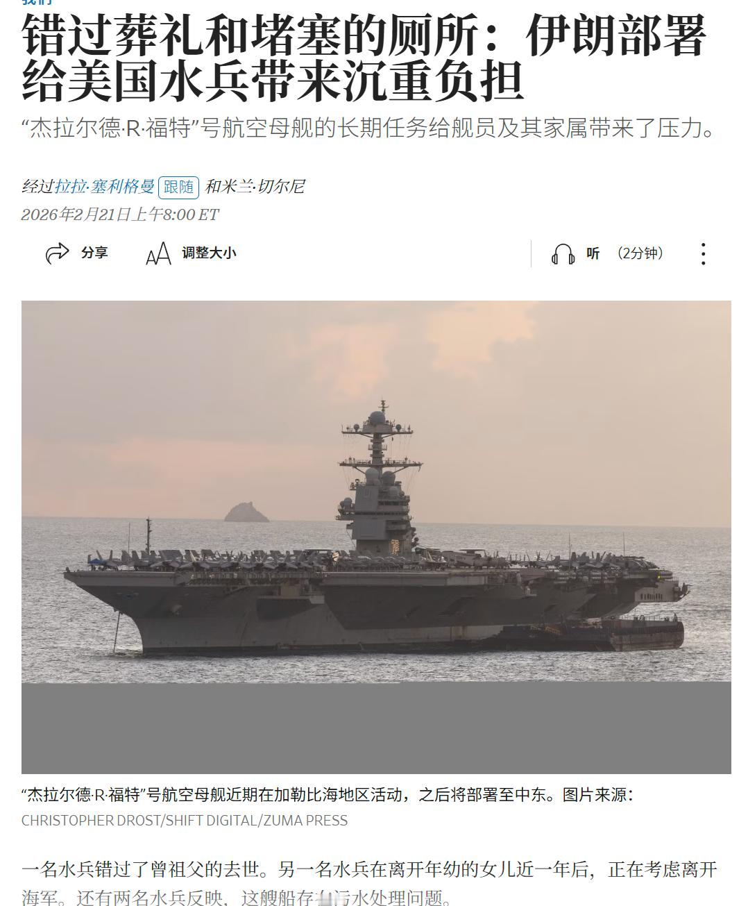 🔻WSJ报道,采访福特号航空母舰上的船员显示,现在很多船员已经对福特号再一次延长部署存在困倦和抱怨。🔻福特号航空母舰于去年6月24日离开北美开始部署,前往了欧洲北欧北海,又跑回加勒比海打委内瑞拉,现在又被拉到地中海准备打伊朗,目前部署时间已经达到了243天,距离核航母最长部署记录294天只有51天,而且眼看奔着超越最长记录去了。🔻福特号水兵抱怨,这艘船的厕所和污水系统存在故障问题,已经发生了多次严重故障,导致船内环境非常恶劣。