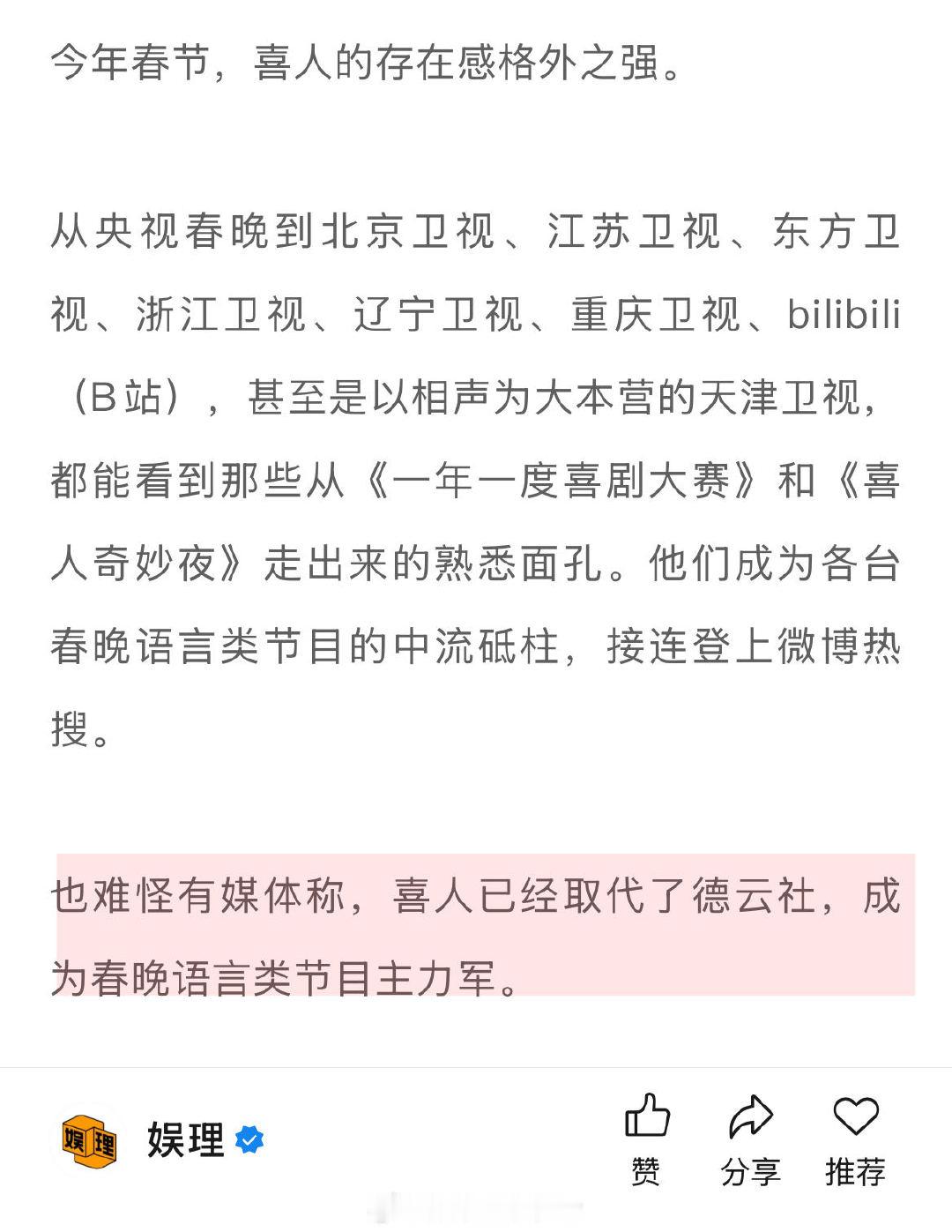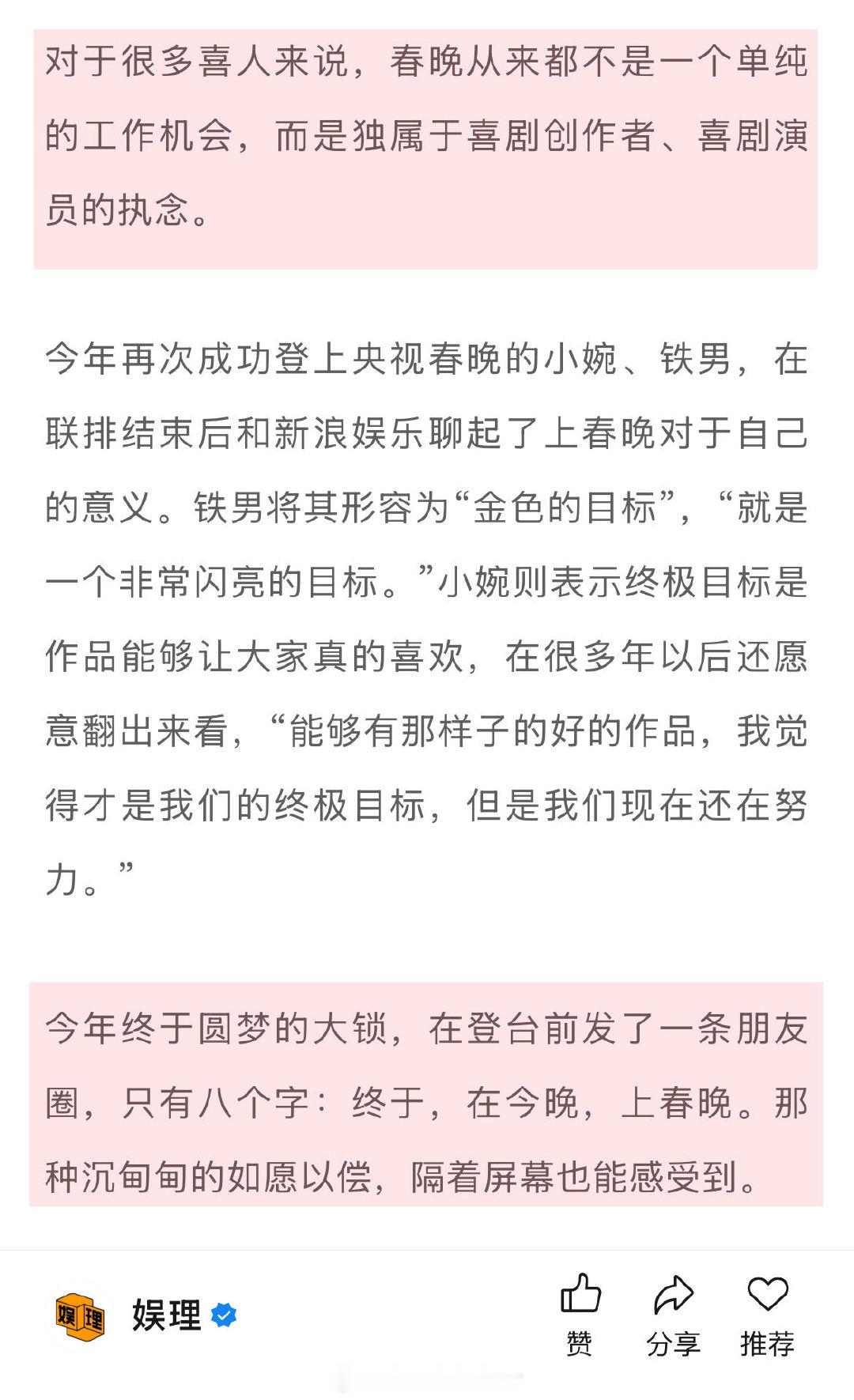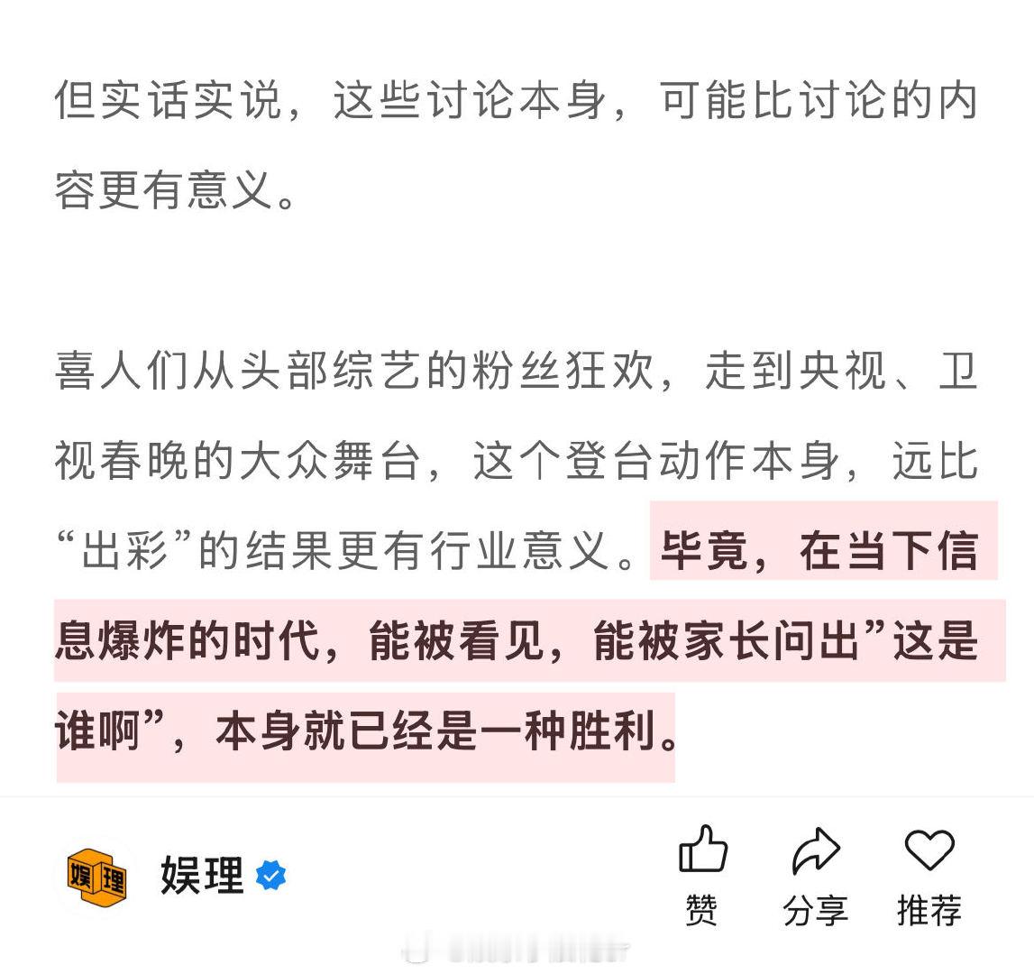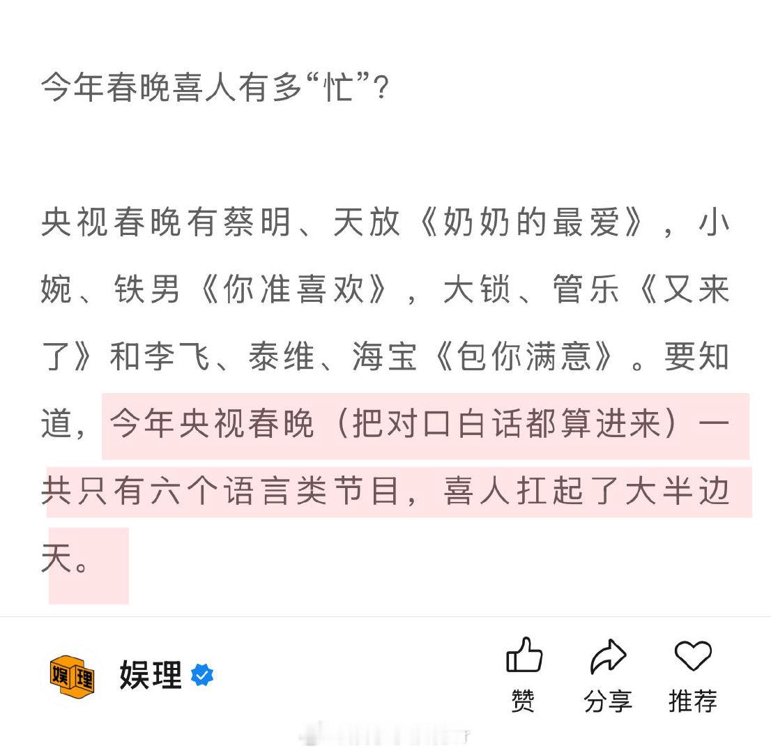 春晚能让喜人升咖吗 喜人扛起春晚半边天 今年春晚喜人有多“忙”?央视春晚有蔡明、天放《奶奶的最爱》,小婉、铁男《你准喜欢》,大锁、管乐《又来了》和李飞、泰维、海宝《包你满意》。要知道,今年央视春晚(把对口白话都算进来)一共只有六个语言类节目,喜人扛起了大半边天…娱理独家↓