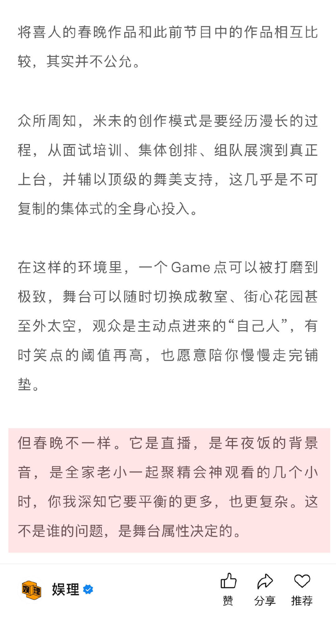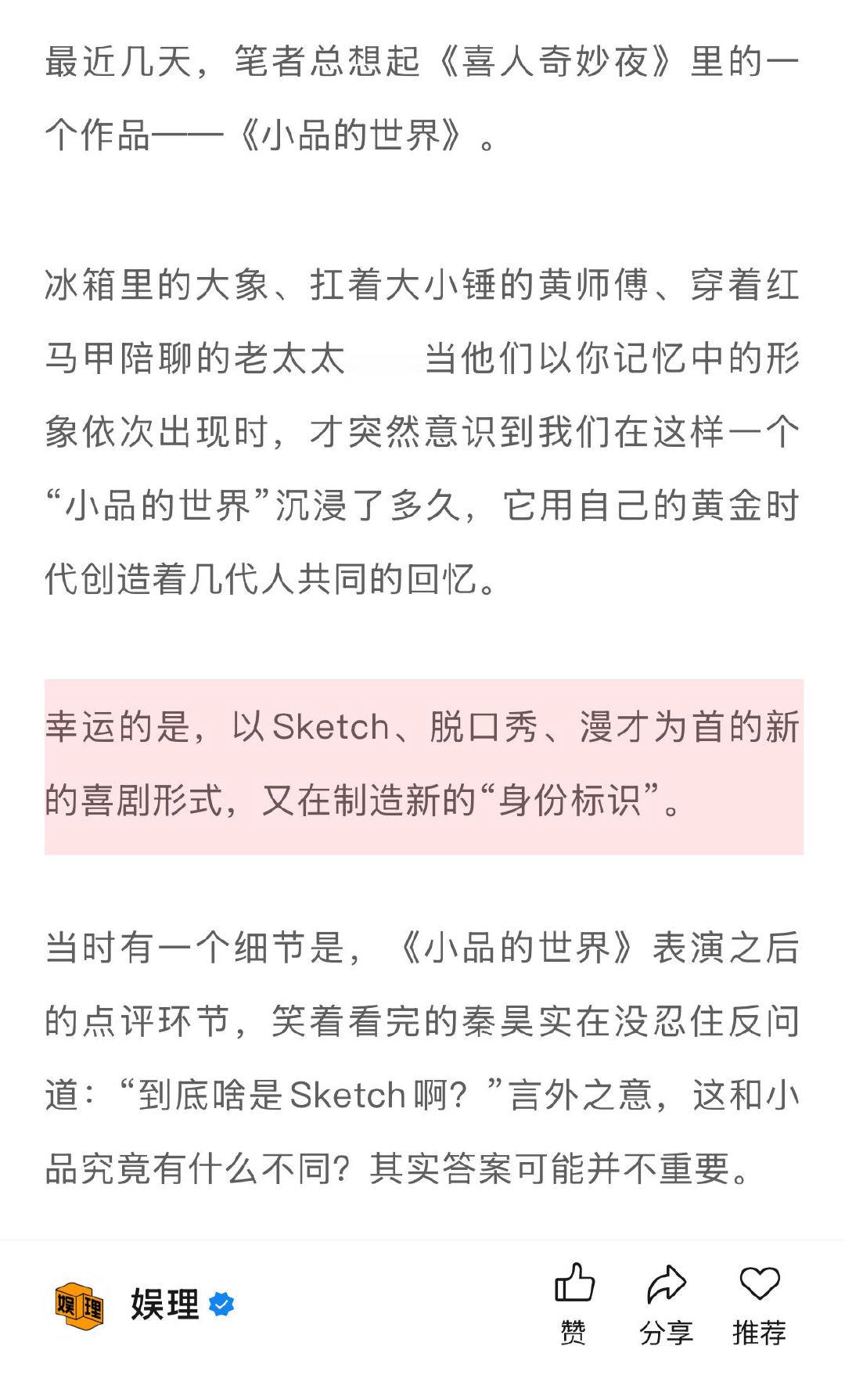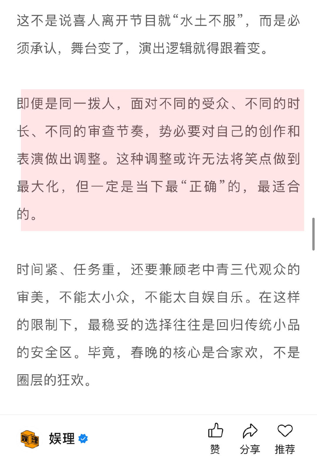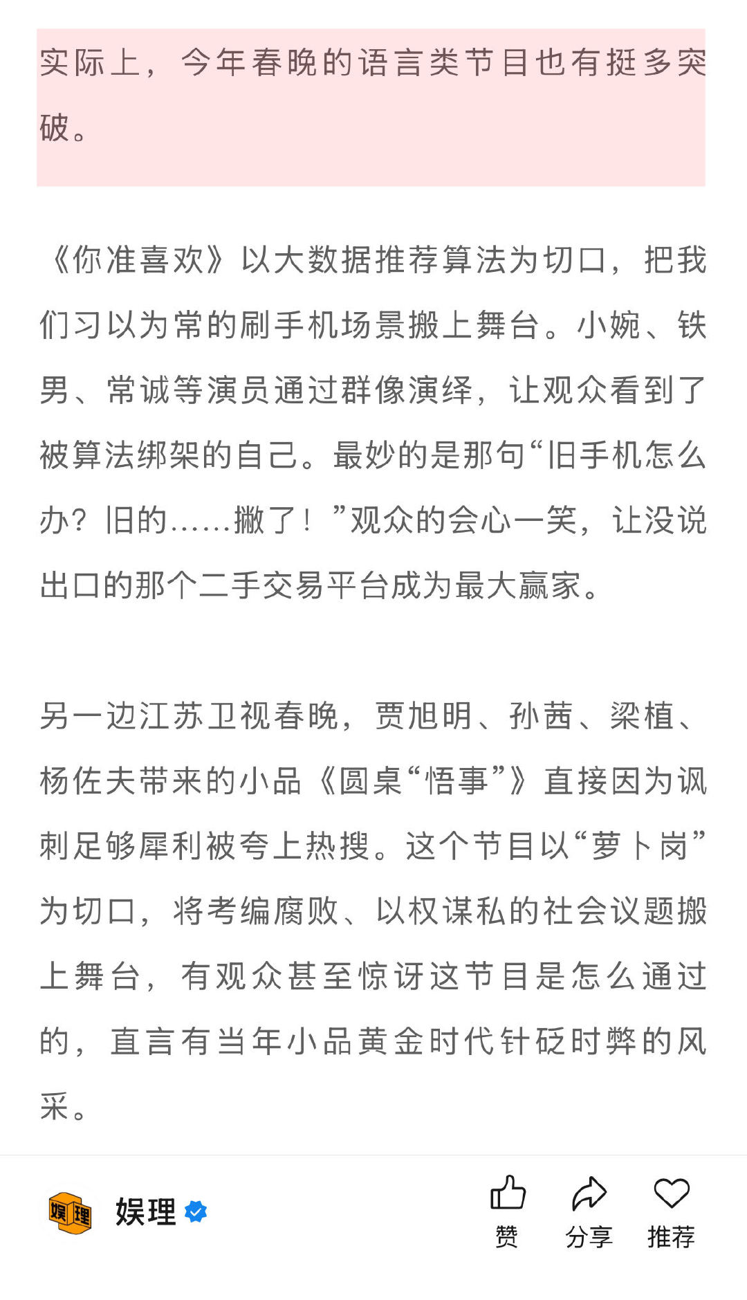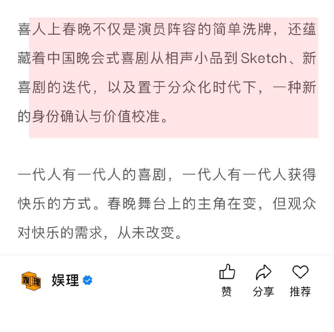 春晚能让喜人升咖吗 喜人扛起春晚半边天 喜人们是先在《一年一度喜剧大赛》和《喜人奇妙夜》里攒够了作品和口碑,才被更多的舞台所看中。 春晚更像是一场“锦上添花”的仪式,而不是喜人的起点,更不要寄托于靠一个舞台实现一夜飞升,在娱乐方式如此多元的今天,早已不现实…娱理独家↓