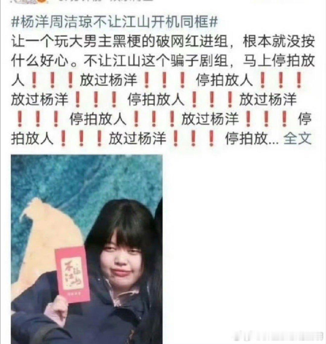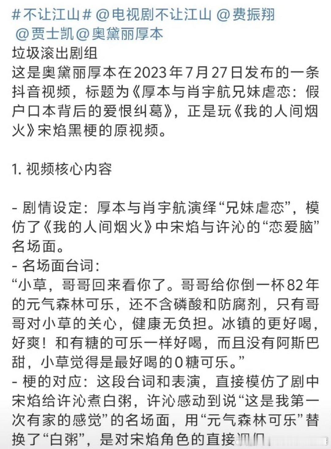 杨洋粉丝抵制厚本进组不让江山,原因是她23年7月发布的视频模仿了《我的人间烟火》宋焰许沁恋爱脑名场面,粉丝认为属于恶搞玩梗