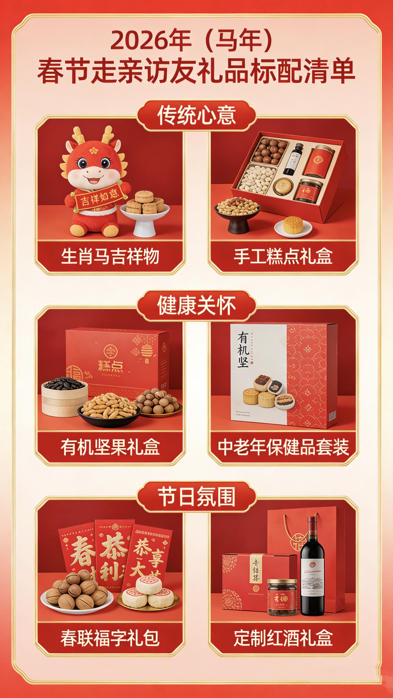 根据2026年春节礼品市场趋势及用户需求,结合健康化、实用性和节日仪式感三大核心要素,整理以下高性价比组合方案: 一、经典实用组合(总价约400-600元) 1. 恋之坊土蜂蜜礼盒(¥168-198) • 正红色烫金礼盒,内含高硼硅玻璃瓶装秦岭深山蜜,源头可溯,适合长辈日常饮用。 • 推荐理由:健康养生,包装喜庆,复购率高。 2. 沃隆纯坚果礼盒(¥109) • 7袋共1200g,含巴旦木、腰果等6种坚果,无添加防腐剂。 • 推荐理由:老少皆宜,年味包装,分量感足。 3. 蒙牛特仑苏纯牛奶(¥39.9×2箱) • 250ml×16盒/箱,家庭早餐必备。 • 推荐理由:刚需消耗品,搭配礼盒更显诚意。 组合说明:总价约¥456,覆盖健康、零食、饮品三大场景,适合预算有限但追求品质的家庭。 二、健康轻奢组合(总价约800-1200元) 1. 小仙炖鲜炖燕窝礼盒(¥699-899) • 45g×7瓶周套餐,冷链配送,开盖即食。 • 推荐理由:高端健康礼,适合送父母或重要长辈。 2. 五谷磨房桃花颜礼盒(¥129.8) • 低GI黑芝麻糊+红枣阿胶粉,无糖配方。 • 推荐理由:养生滋补,女性长辈友好。 3. 南卡Runner4骨传导耳机(¥599) • 轻量化设计,IP68防水,适合运动场景。 • 推荐理由:科技实用品,送中青年亲友显心意。 组合说明:总价约¥1127,兼顾健康与科技感,适合追求品质的中高预算场景。 三、家庭全覆盖组合(总价约1500-2000元) 1. 希亦W1擦窗机器人(¥899) • 欧盟CE认证,150kg防坠绳,高层清洁神器。 • 推荐理由:解决家庭清洁痛点,实用性强。 2. 稻香村糕点礼盒(¥89) +旺旺大礼包(¥96) • 传统点心+儿童零食,覆盖全年龄段。 • 推荐理由:节日氛围拉满,适合大家庭。 3. 山珍菌菇礼盒(¥398-598) • 含松茸、羊肚菌等,丝绒内衬烫金包装。 • 推荐理由:高端食材,适合商务往来或重要亲戚。 组合说明:总价约¥1980,从家居清洁到饮食娱乐全面覆盖,适合大家庭或重要社交场合。 四、极简性价比组合(总价约200-300元) 1. 知味观糕点礼盒(¥145) • 杭州特产,含绿豆糕、龙井茶酥等。 • 推荐理由:地方特色,价格亲民。 2. 京鲜生耙耙柑(¥69.8×2箱) • 10斤/箱,甜度高易剥皮。 • 推荐理由:新鲜水果,补充维生素。 3. 希亦ACE2内衣洗衣机(¥待定,参考价约¥1000+) • 注:若预算充足可替换坚果礼盒,高温煮洗功能适合送新婚夫妇。 组合说明:总价约¥324(不含内衣洗衣机),适合年轻群体或小家庭,轻便不失体面。 选购建议 1. 健康属性优先:87%消费者关注礼品健康性,燕窝、蜂蜜、粗粮礼盒为首选。 2. 包装仪式感:正红色、烫金、丝绒等元素提升节日氛围。 3. 灵活组合:根据关系亲疏调整预算,如普通亲戚选经典组合,重要长辈选健康轻奢组合。 以上方案综合了2026年市场热销款及用户口碑,可根据实际需求灵活搭配。