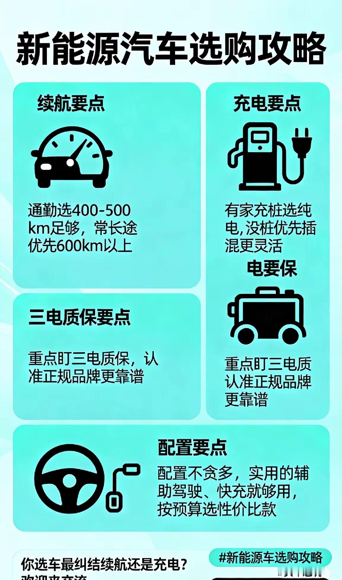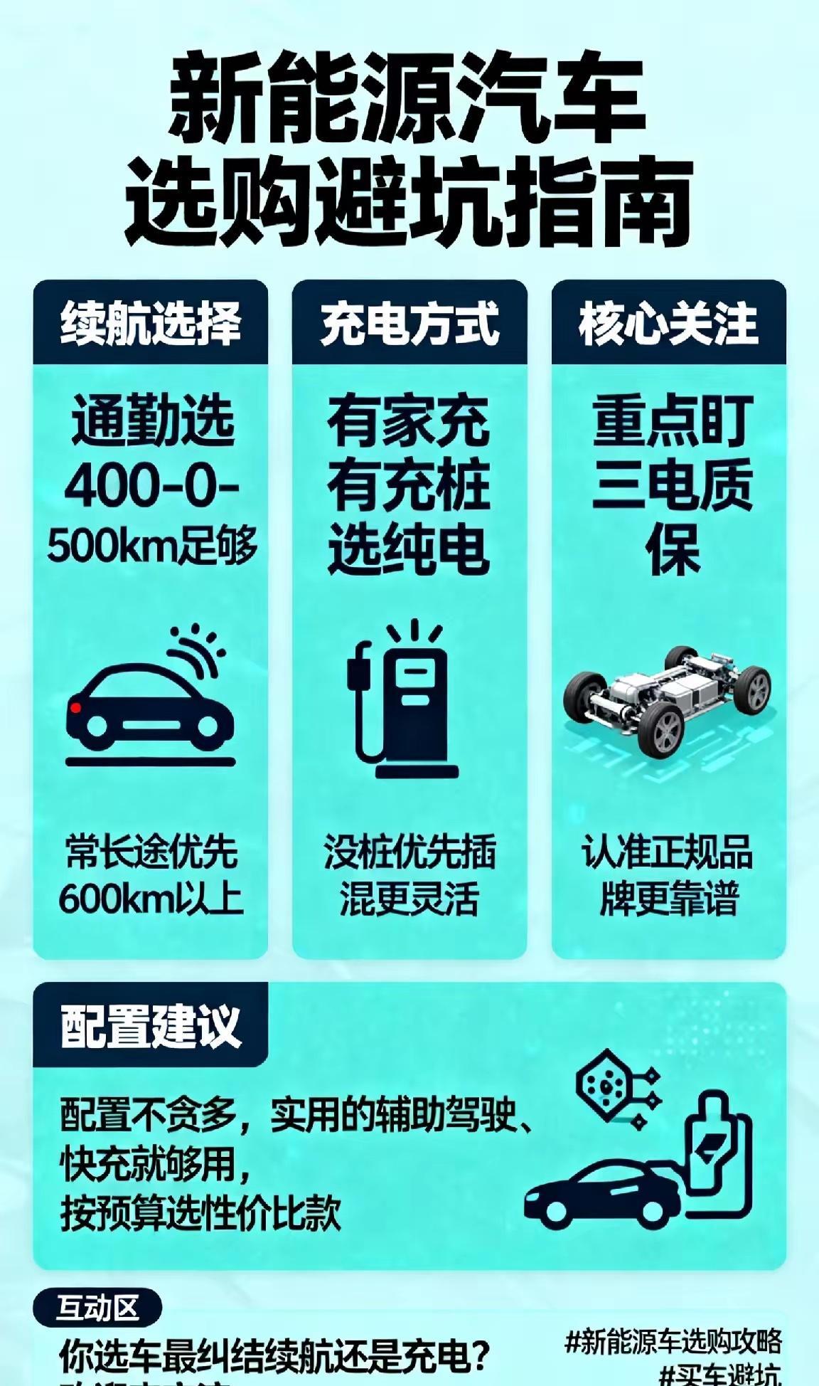 选新能源汽车不踩坑,抓住这几点就够!先看续航,通勤选400-500km足够,常长途优先600km以上;再看充电,有家充桩选纯电,没桩优先插混更灵活;重点盯三电质保,认准正规品牌更靠谱;配置不贪多,实用的辅助驾驶、快充就够用,按预算选性价比款。你选车最纠结续航还是充电?欢迎来交流~