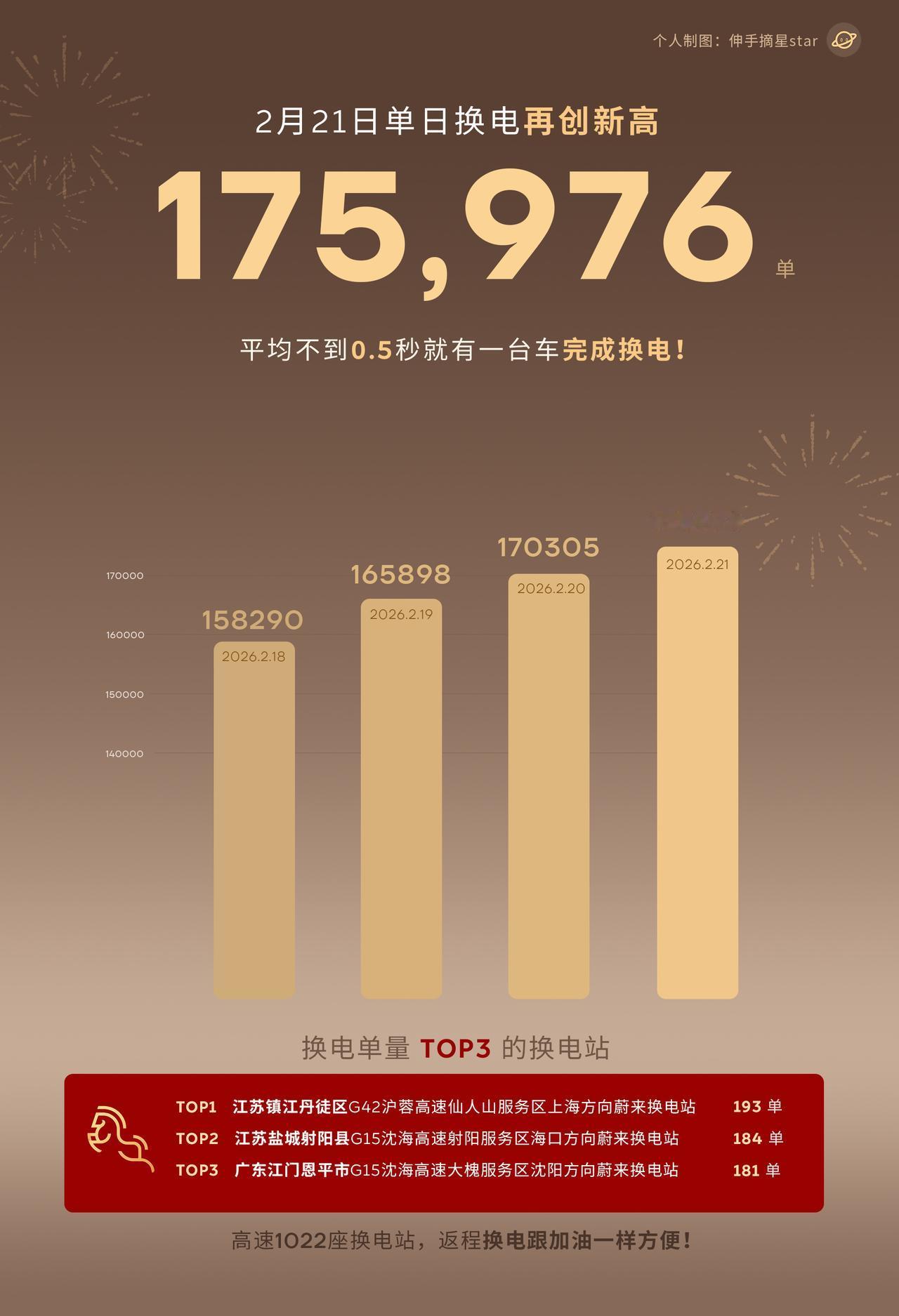 基建狂魔蔚来, 马年的每一天,换电都在创造历史, 每一天都是创造新高。 从18日15万单到 21日17万单, 每天新增5000单左右。 昨天换电175976单, 单站均47单。 今天,应该我贡献了一单。 春节返程高峰会创造出日均18万换电吗? 我们一起拭目以待。 换电站日60单就能盈利, 需要单日换电18.5万次。 蔚来 蔚来销量 蔚来换电网络 蔚来换电
