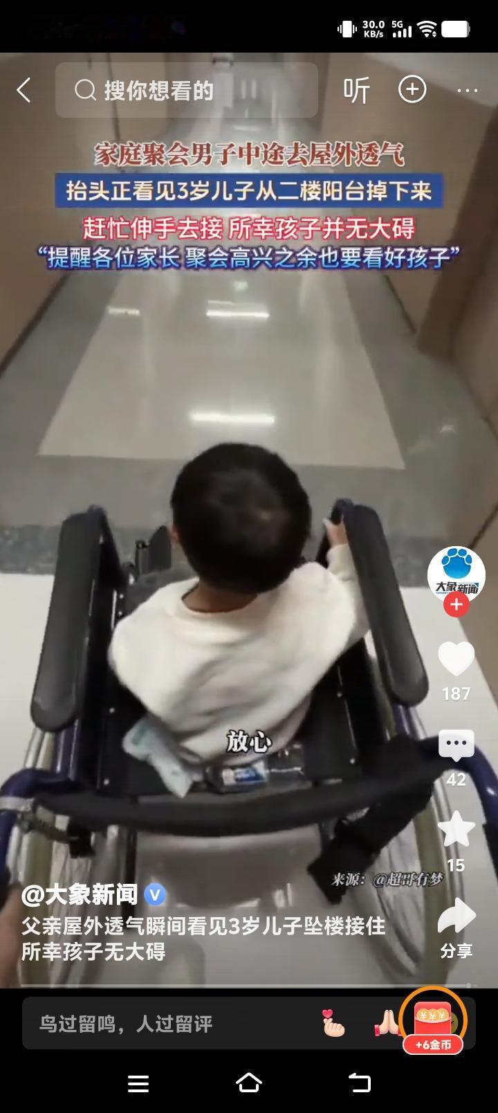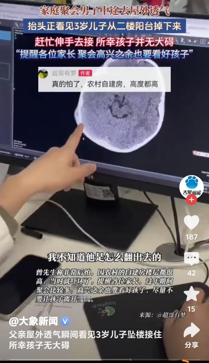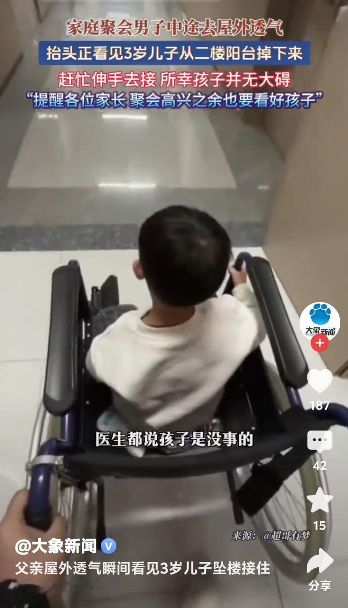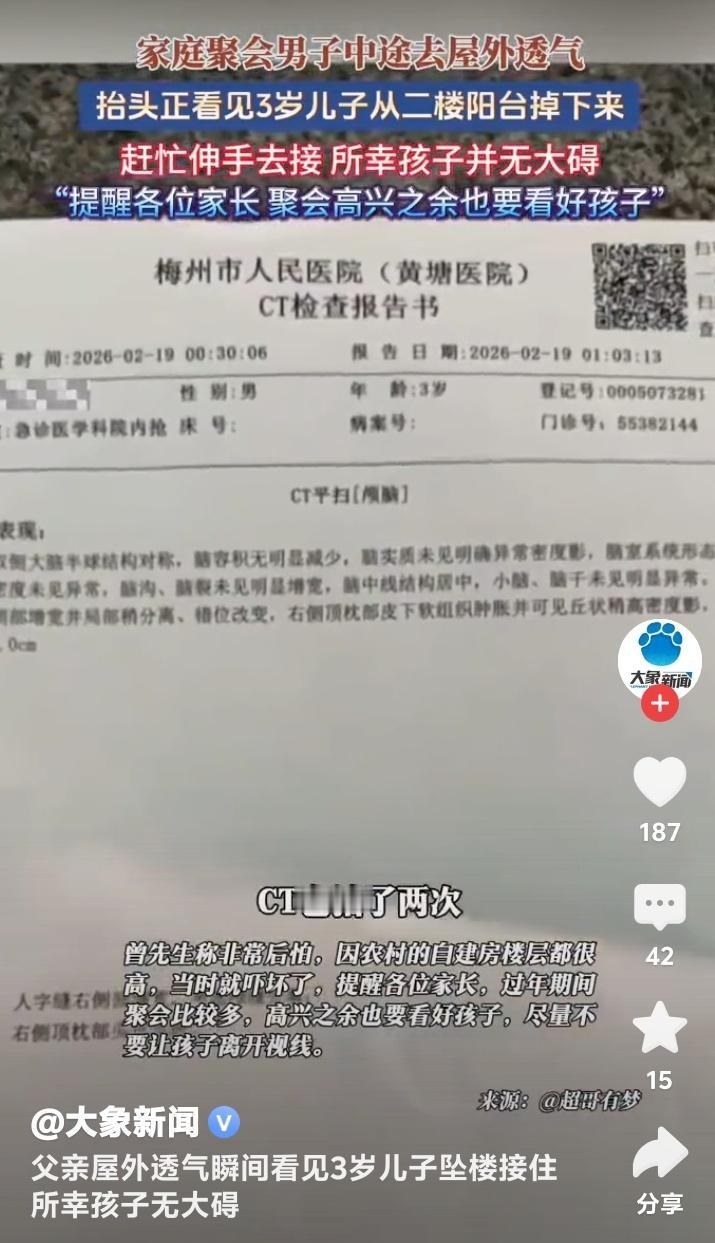 广东惊魂3秒!父亲聚会中途离席透气,抬头竟见3岁幼子从二楼阳台坠落,本能一接改写生死结局! 那只是一个再普通不过的团圆日。广东梅州,大年初二的暖阳里,曾先生与亲友把酒言欢,热闹填满了老屋的每个角落。或许是被喧嚣裹得有些闷,他放下酒杯,信步走向屋外,只想寻一刻清静。谁曾想,这随意的几步,竟在下一秒将他推向了命运最惊心动魄的十字路口。 就在他抬头舒气的瞬间,全身血液仿佛骤然凝固——二楼阳台上,那个熟悉的小小身影,正摇摇欲坠!那是他年仅3岁的儿子!没有呼喊,没有迟疑,甚至来不及感到恐惧,父亲的身体已如离弦之箭冲了出去。他的世界在那一刻缩窄成一条下坠的弧线,和一双不顾一切伸出的手臂。 “砰”的一声闷响,孩子重重砸在他的臂弯里,又滚落在地。巨大的冲击力让曾先生双臂发麻,心臟几乎停跳。他扑过去抱起孩子,声音都在颤抖。万幸!经梅州市人民医院紧急检查,孩子除了惊吓和轻微软组织挫伤,竟奇迹般地无大碍。医生都感叹,若不是父亲那一挡缓冲了绝大部分下坠力,后果不堪设想。 事后回看,满是后怕。农村自建房楼层高,阳台护栏的缝隙对于好奇的孩子而言,就是致命的陷阱。曾先生说,至今不知孩子如何翻爬出去。那一刻的“刚好”,是命运在呼吸间的仁慈,更是父爱本能创造的奇迹。它无关运气,那是深植于血脉中的守护程序,在危机降临的毫秒间自动启动。 这场意外,像一记响亮的警钟,敲在每一个为人父母的心上。节日欢聚,推杯换盏间,最容易放松对“小神兽”的看管。危险往往就潜伏在那视线离开的几分钟里。它撕开了一个我们不愿直视的真相:在孩子的安全问题上,从来没有“万一”,只有“一万”的小心。 我们感动于父爱的本能,更应深思这本能被激发的缘由。它本不该被需要。每一个“有惊无险”的故事背后,都可能藏着可以避免的疏忽。老旧房屋的防护缺失、家长瞬间的注意力转移,都是需要补上的安全漏洞。这份后怕,不应只停留在一家人的庆幸里。 曾先生的经历,是一次生命的警示馈赠。它告诉我们,守护孩子,不能仅靠事发的本能反应,更要靠事前的万分警惕。检查家中的每一个窗口,留意阳台的每一处缝隙,聚会时明确专人看管孩子……这些琐碎的细节,才是真正坚固的“防护栏”。 这个父亲用他的双臂,接住了一个家庭的未来。而我们,能否用更周全的预防,接住更多孩子平安成长的每一天?愿这份惊险之后的平安,能唤醒更多沉睡的安全意识,让类似的“本能救援”不再有上演的机会。 (来源:根据@超哥有梦、大象新闻、红星新闻等综合报道) 儿童安全 父爱本能
