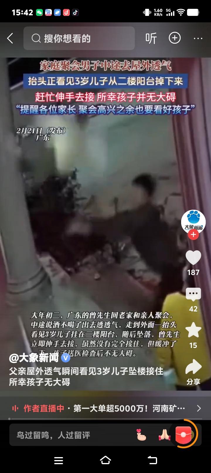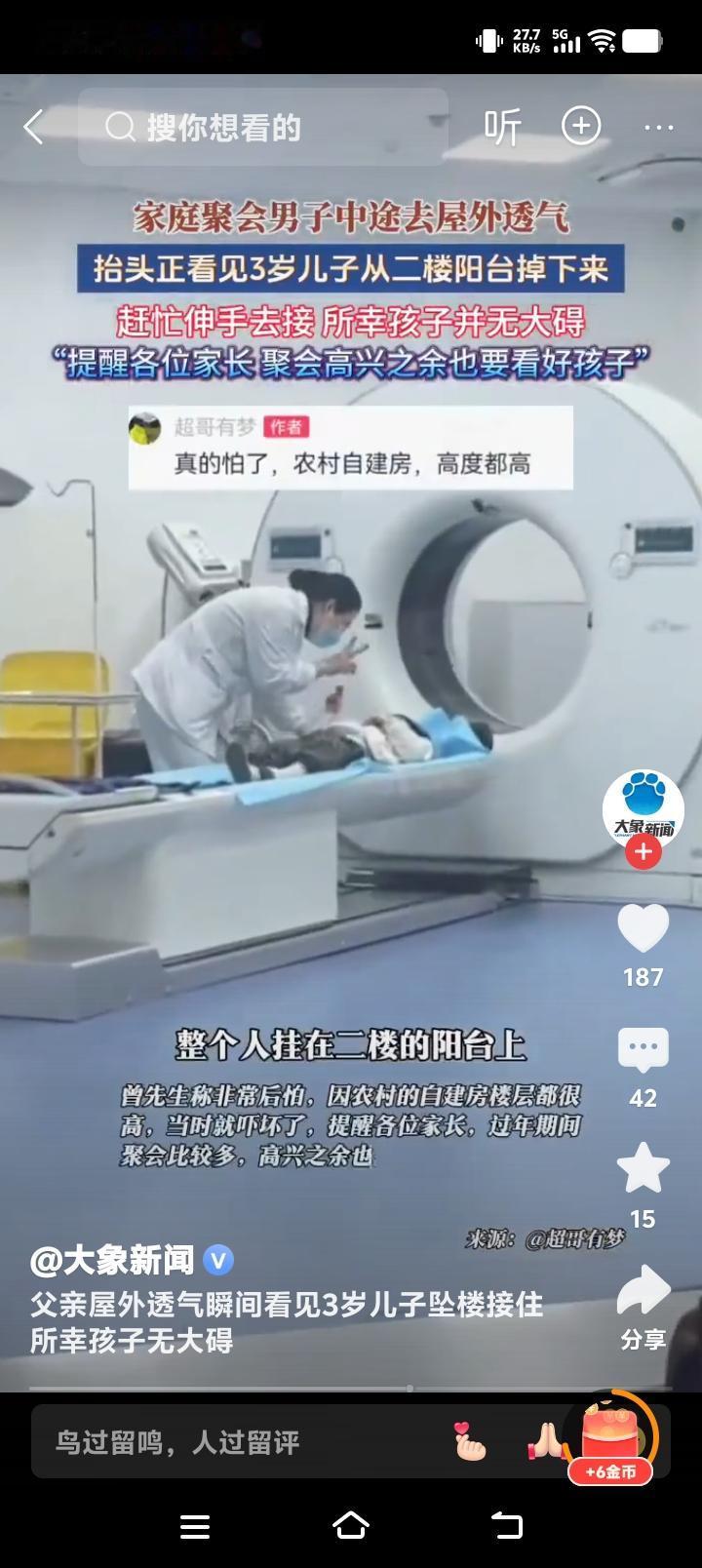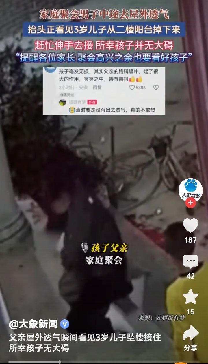 广东惊魂3秒!父亲聚会中途离席透气,抬头竟见3岁幼子从二楼阳台坠落,本能一接改写生死结局! 那只是一个再普通不过的团圆日。广东梅州,大年初二的暖阳里,曾先生与亲友把酒言欢,热闹填满了老屋的每个角落。或许是被喧嚣裹得有些闷,他放下酒杯,信步走向屋外,只想寻一刻清静。谁曾想,这随意的几步,竟在下一秒将他推向了命运最惊心动魄的十字路口。 就在他抬头舒气的瞬间,全身血液仿佛骤然凝固——二楼阳台上,那个熟悉的小小身影,正摇摇欲坠!那是他年仅3岁的儿子!没有呼喊,没有迟疑,甚至来不及感到恐惧,父亲的身体已如离弦之箭冲了出去。他的世界在那一刻缩窄成一条下坠的弧线,和一双不顾一切伸出的手臂。 “砰”的一声闷响,孩子重重砸在他的臂弯里,又滚落在地。巨大的冲击力让曾先生双臂发麻,心臟几乎停跳。他扑过去抱起孩子,声音都在颤抖。万幸!经梅州市人民医院紧急检查,孩子除了惊吓和轻微软组织挫伤,竟奇迹般地无大碍。医生都感叹,若不是父亲那一挡缓冲了绝大部分下坠力,后果不堪设想。 事后回看,满是后怕。农村自建房楼层高,阳台护栏的缝隙对于好奇的孩子而言,就是致命的陷阱。曾先生说,至今不知孩子如何翻爬出去。那一刻的“刚好”,是命运在呼吸间的仁慈,更是父爱本能创造的奇迹。它无关运气,那是深植于血脉中的守护程序,在危机降临的毫秒间自动启动。 这场意外,像一记响亮的警钟,敲在每一个为人父母的心上。节日欢聚,推杯换盏间,最容易放松对“小神兽”的看管。危险往往就潜伏在那视线离开的几分钟里。它撕开了一个我们不愿直视的真相:在孩子的安全问题上,从来没有“万一”,只有“一万”的小心。 我们感动于父爱的本能,更应深思这本能被激发的缘由。它本不该被需要。每一个“有惊无险”的故事背后,都可能藏着可以避免的疏忽。老旧房屋的防护缺失、家长瞬间的注意力转移,都是需要补上的安全漏洞。这份后怕,不应只停留在一家人的庆幸里。 曾先生的经历,是一次生命的警示馈赠。它告诉我们,守护孩子,不能仅靠事发的本能反应,更要靠事前的万分警惕。检查家中的每一个窗口,留意阳台的每一处缝隙,聚会时明确专人看管孩子……这些琐碎的细节,才是真正坚固的“防护栏”。 这个父亲用他的双臂,接住了一个家庭的未来。而我们,能否用更周全的预防,接住更多孩子平安成长的每一天?愿这份惊险之后的平安,能唤醒更多沉睡的安全意识,让类似的“本能救援”不再有上演的机会。 (来源:根据@超哥有梦、大象新闻、红星新闻等综合报道) 儿童安全 父爱本能
