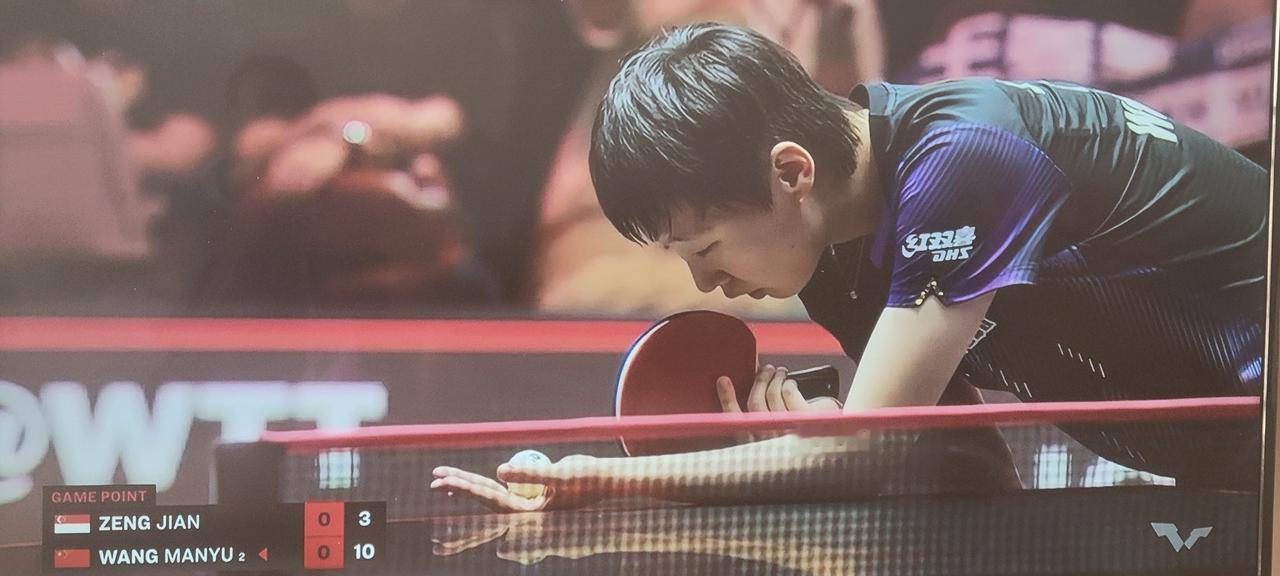 曼昱3:0零封曾尖,取得开门红! 看完这场比赛,总体感觉是,这不是一个量级的比赛,双方实力悬殊太大。 在强大的曼昱面前,曾尖不是球接高了,就是被曼昱的拧拉和犀利的进攻打得毫无办法,因此很快以0:3落败并在三局中总共只得8分,当在情理之中。只能说曾尖运气太不好了,首轮就遇到了实力十分强大的曼昱。