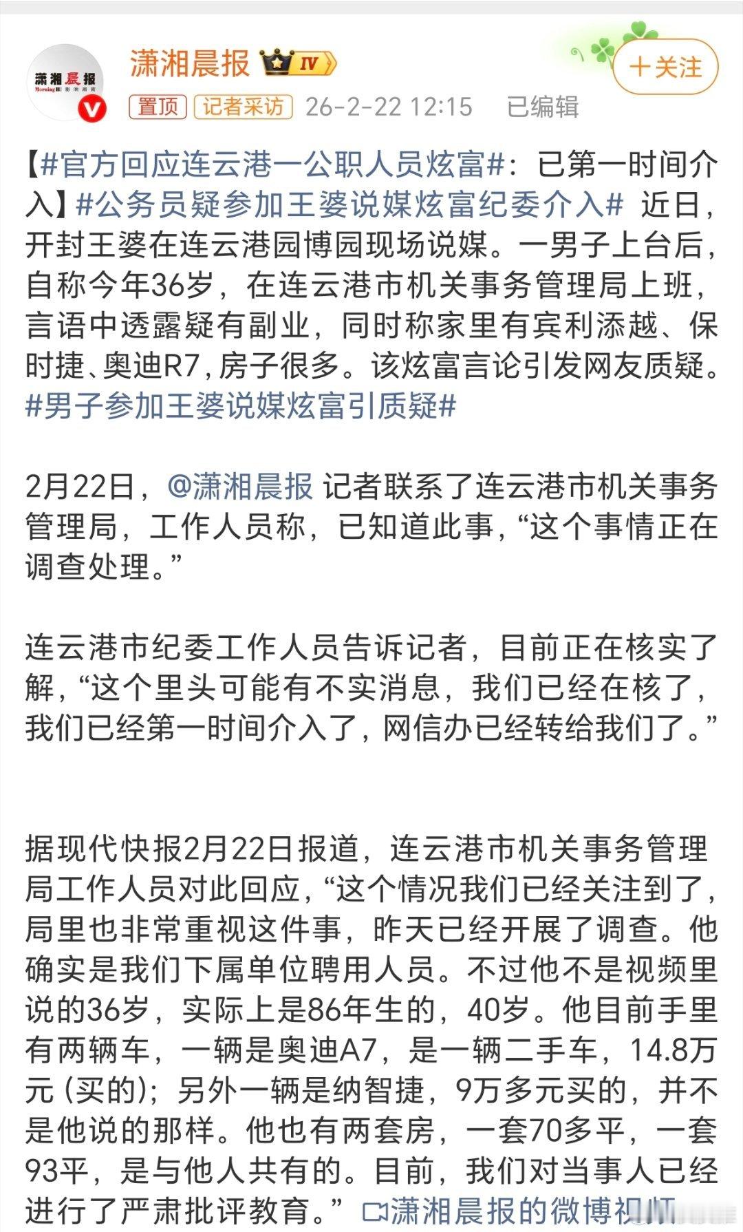 官方回应连云港一公职人员炫富网友评论:他房子车子多不多我不知道,但是智商严重不足是可以确定的 科技先锋官