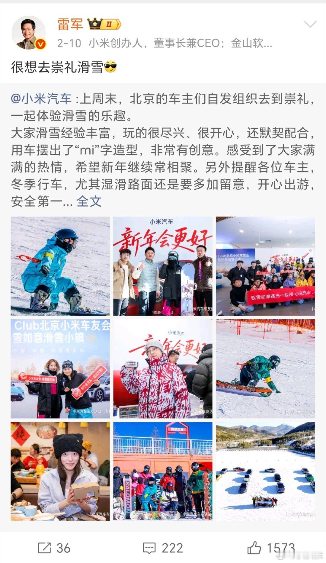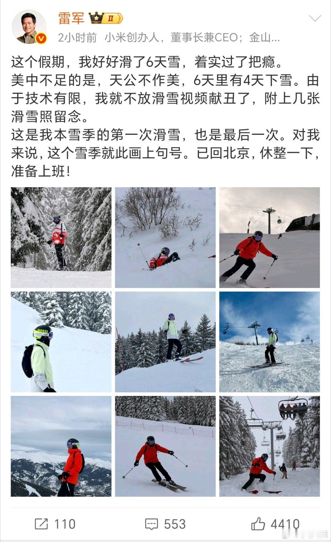 雷军假期滑了6天雪2月10日,雷军就发文表示想去崇礼滑雪,今天大年初六,他都也已经滑6天雪了,这执行力真的没话说。科技先锋官