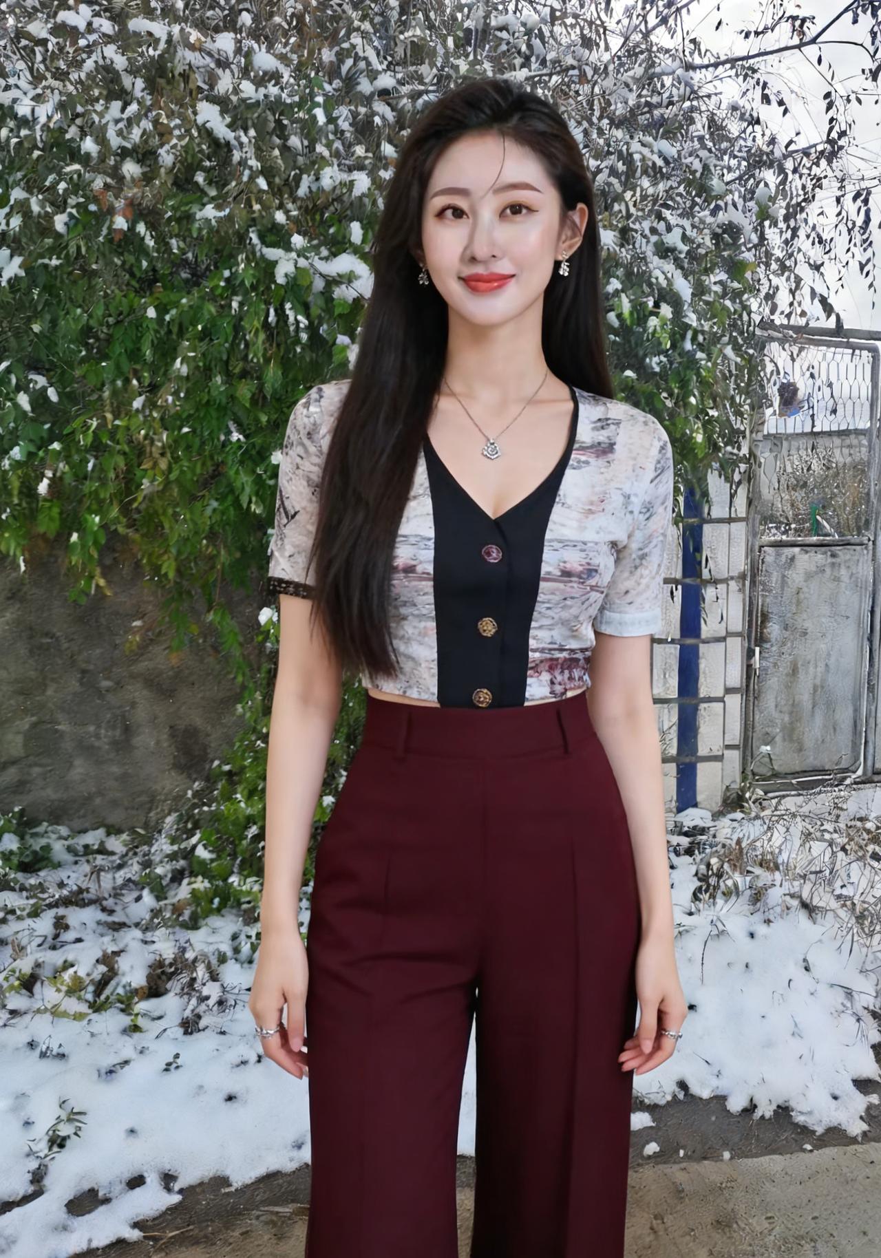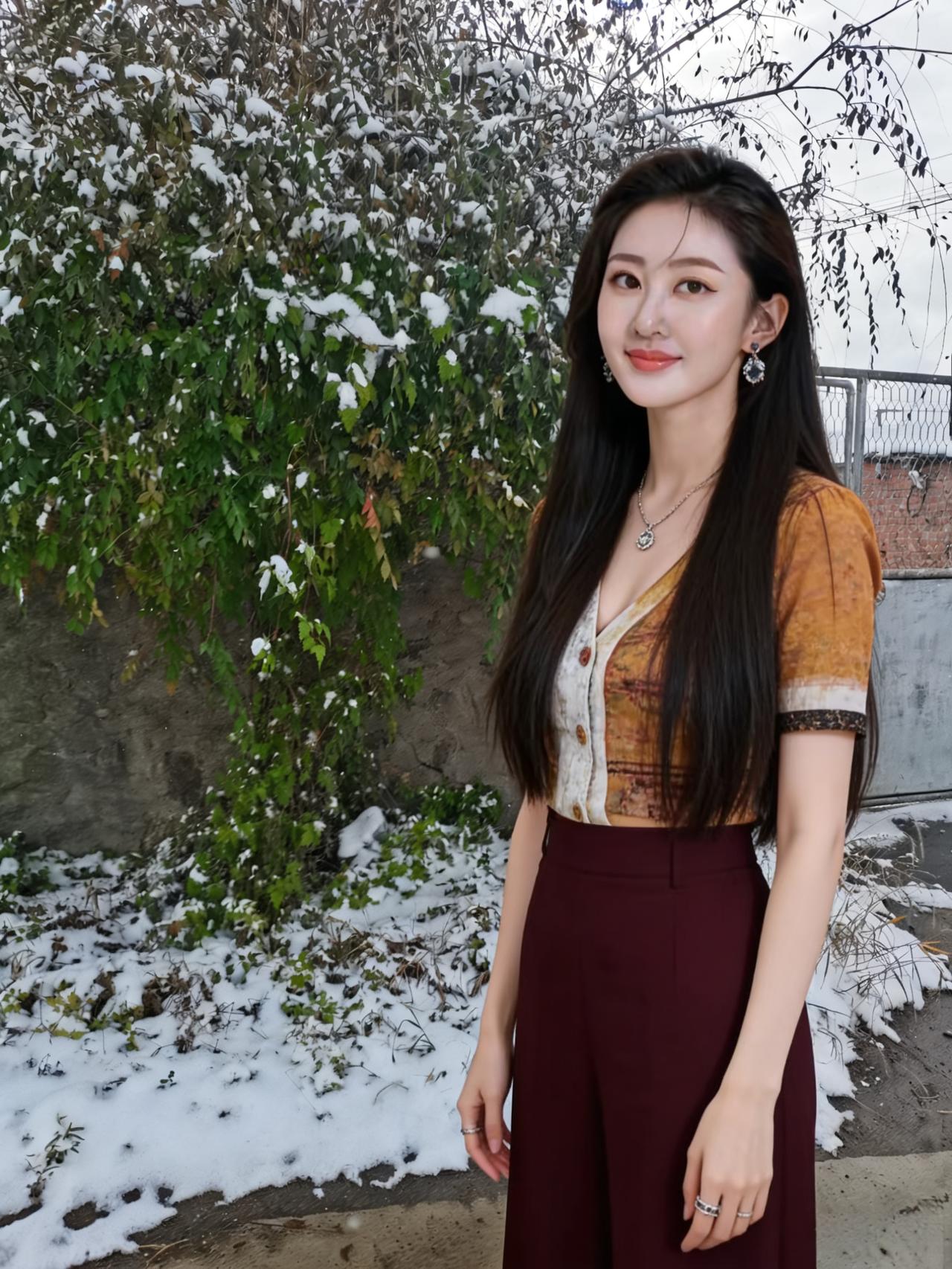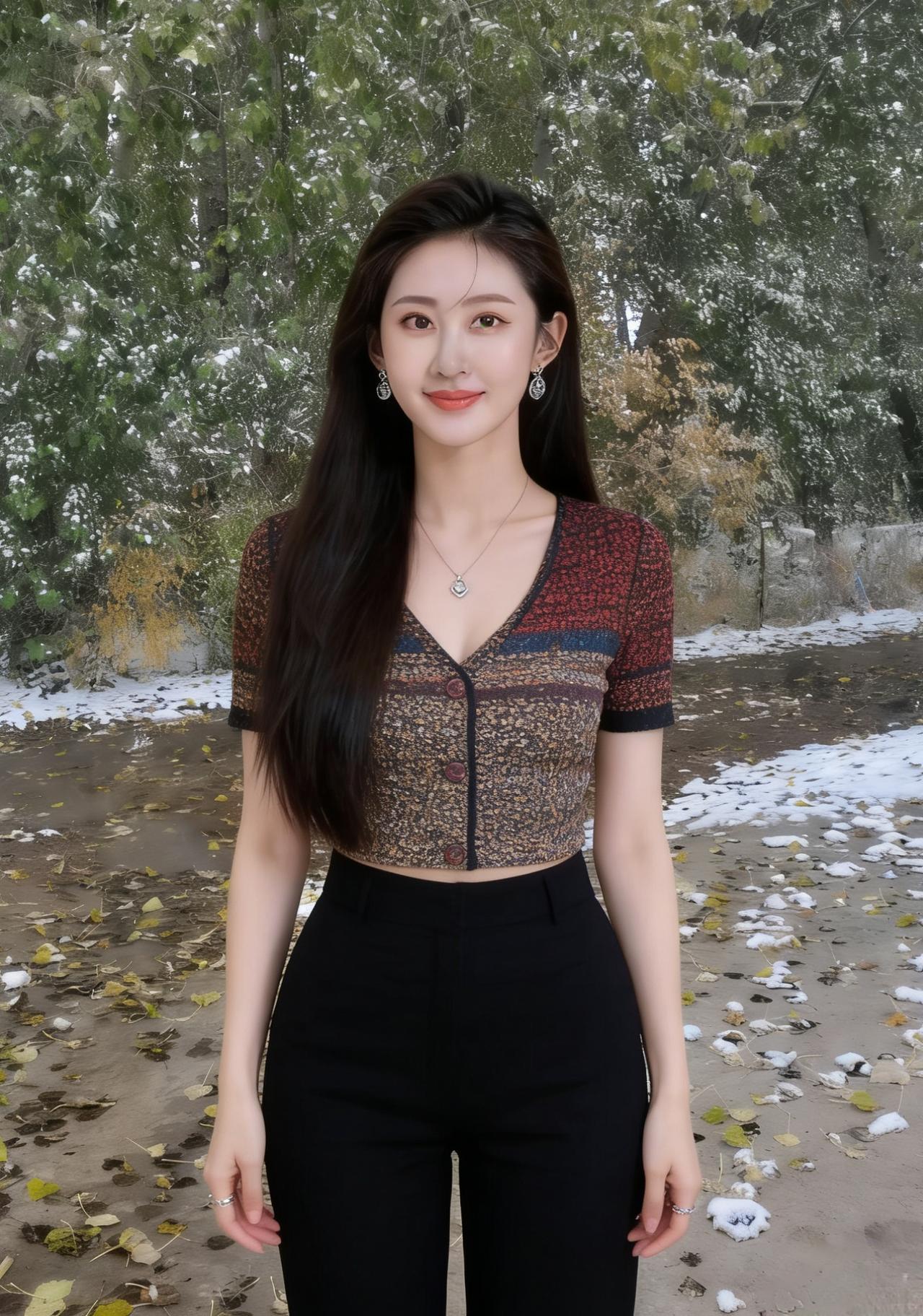 雪覆藤墙绿,霜凝石径寒。 花衫裁碎锦,绛裤绾清欢。 珠佩摇寒月,金徽映晓峦。 凝眸尘事外,一笑解眉端。