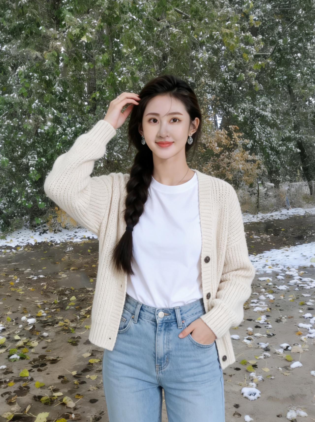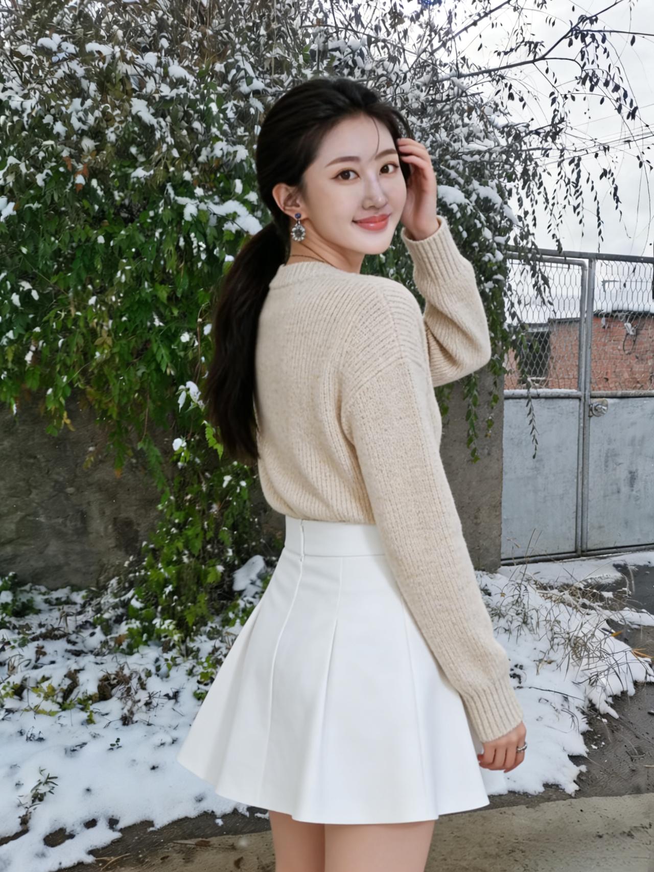 蓝裙轻曳雪初融,一笑嫣然破朔风。 莫道春光无觅处,美人眸里隐桃红。