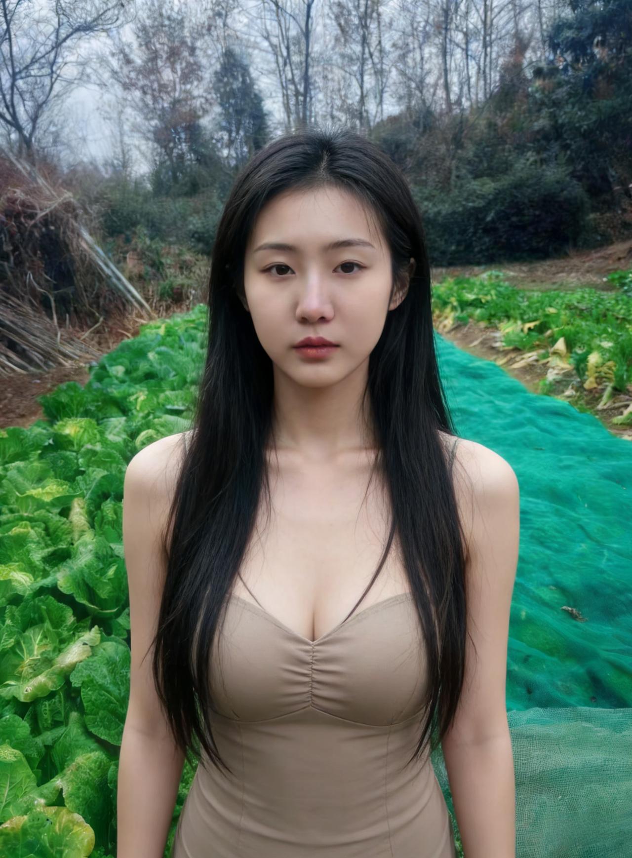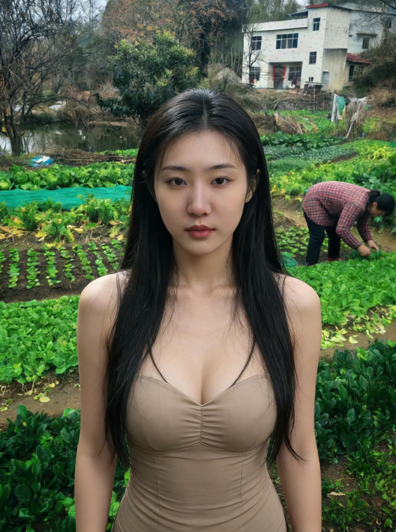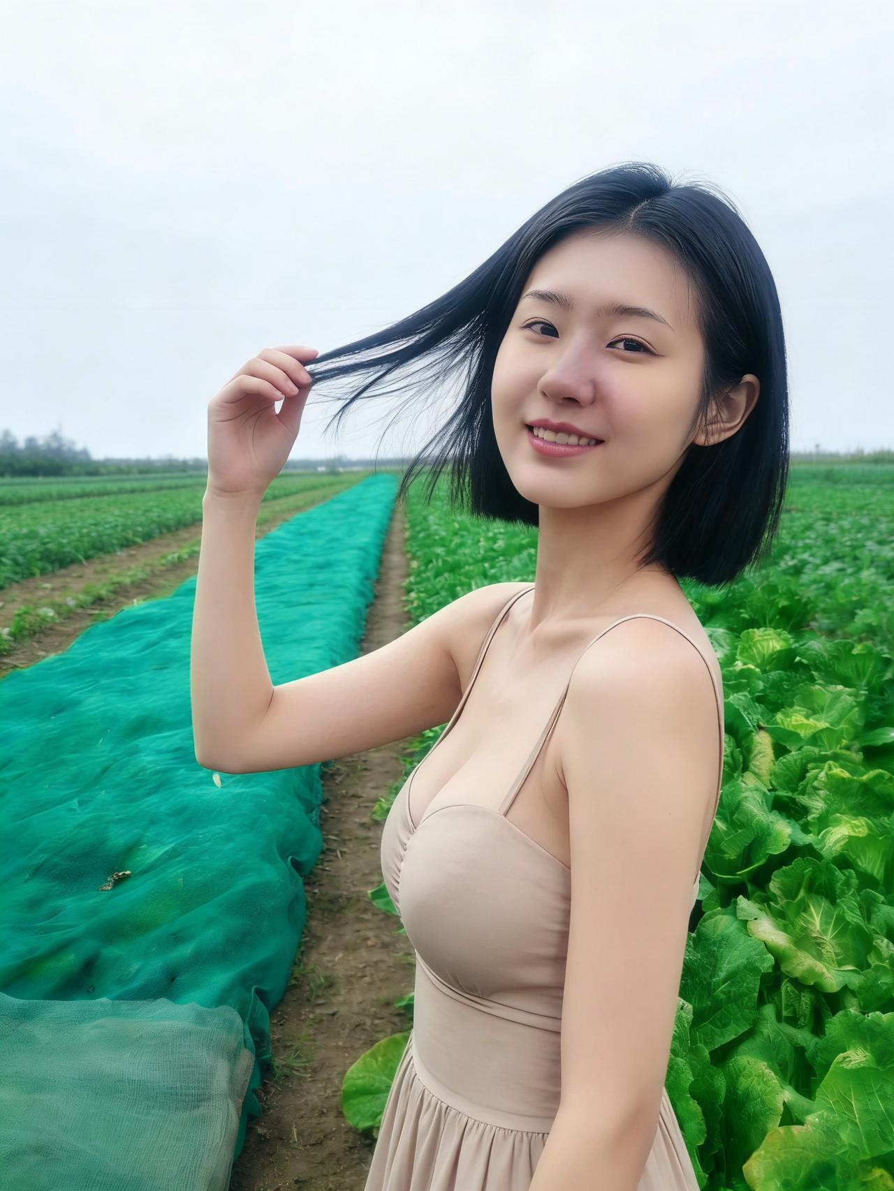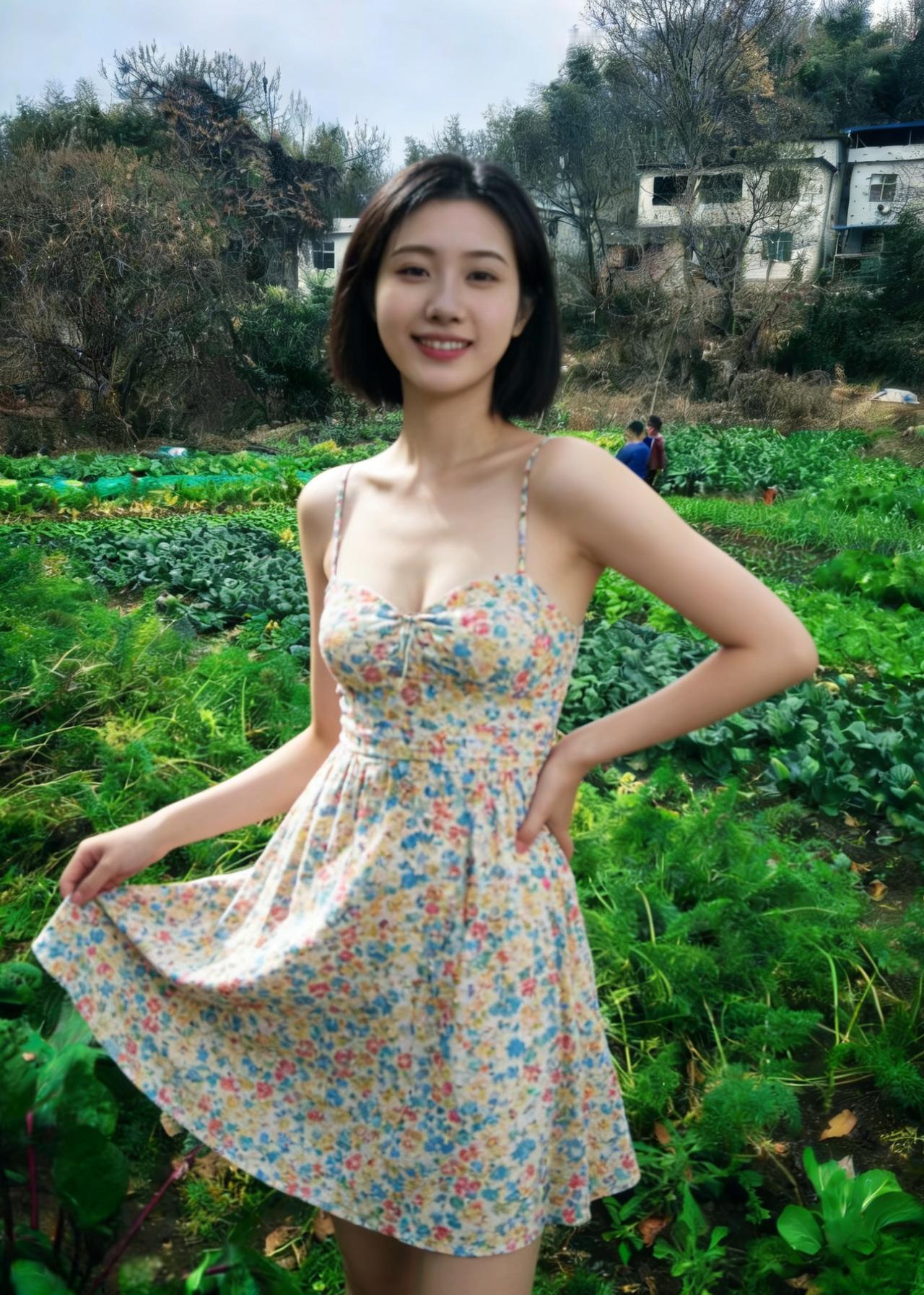 她是田埂上垂落的云 裙摆轻擦过青菜的晨露 短发在风里铺开浅淡的星子 闭眼时,呼吸和稻浪一起起伏 ~ 旧绿的网布接住了正午的光 她的影子在泥里弯成桥 从一片秧苗到另一片菜地 脚印里盛着半捧湿润的烟火 ~ 远处的白墙是未写完的句子 她抬手拢发的弧度 让玉米叶都学会了温柔 笑起来时,所有的阴天都亮了 ~ 裙角沾着细碎的草屑 像岁月偷偷绣上的花 她站在那里,不是风景 是风愿意为她停驻的理由