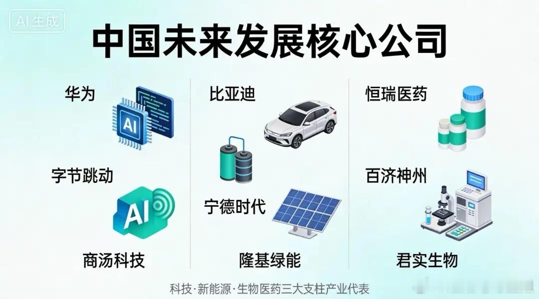 你们知道有哪些公司:关系到国家未来的发展:欢迎大家评论区留言:我觉得下面这些公司决定国家科技、能源、制造、国防与数字安全,是国运级核心资产。一、半导体/芯片(科技自立最核心)中芯国际(688981):大陆晶圆代工龙头,14nm/7nm攻坚北方华创(002371):刻蚀/沉积设备国产龙头中微公司(688012):刻蚀机进入先进制程华虹公司(688347):特色工艺+功率器件华大九天(301269):国产EDA核心长江存储/长鑫存储:存储芯片自主二、AI与算力(数字经济底座)中科曙光(603019):AI服务器市占率第一寒武纪(688256):国产AI芯片龙头海光信息(688041):国产x86算力浪潮信息(000977):全球服务器龙头华为(未上市):昇腾+鲲鹏+盘古大模型三、新能源(能源安全+碳中和)宁德时代(300750):全球动力电池第一比亚迪(002594):新能源整车+全产业链隆基绿能/通威股份:光伏全产业链阳光电源(300274):储能+逆变器龙头国家电网/南方电网:新型电力系统核心四、高端制造/工业母机(制造强国)中国中车(601766):高铁+轨交装备全球第一科德数控/秦川机床:五轴联动工业母机埃斯顿(002747):工业机器人国产龙头汇川技术(300124):工控+伺服系统中国船舶/中国重工:航母+大型船舶五、航空航天(国防+空天安全)航天科技/航天科工:火箭、卫星、导弹、空间站航空工业:歼20、运20、C919、航空发动机中航沈飞/中航西飞:军机核心主机厂中国商飞:C919/CR929大飞机六、通信与数字基建(数字中国)华为/中兴通讯(000063):5G/6G设备+通信安全中国移动/联通/电信:全球最大通信网络紫光股份/锐捷网络:数通设备+算力网络国盾量子(688027):量子通信安全七、能源与资源(国家压舱石)中石油/中石化/中海油/中化:能源安全四梁八柱中国神华:煤炭+煤电+煤化工中核集团/中国广核:华龙一号+核能全产业链八、材料与生物(底层硬科技)万华化学(600309):全球MDI龙头,新能源材料西部超导/中简科技:航空航天高端材料凯赛生物/华恒生物:合成生物学全球领先总结:以上这些公司是科技自立、能源安全、制造升级、国防安全、数字强国的核心载体,决定中国未来30年全球竞争力。各位股友,你们觉得呢?欢迎大家一起讨论讨论!