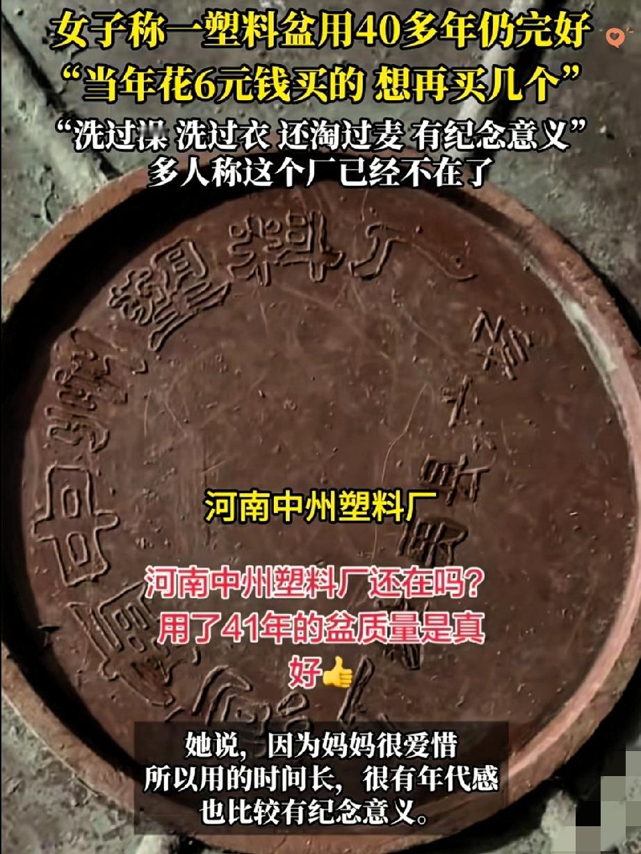 河南一只塑料盆用了40多年没坏,6块钱买的,比人还耐用! 当年花6元钱入手,给孩子洗过澡、搓过衣服、淘过麦子,啥粗活都干过,如今只是颜色泛黄,盆身依旧结实不开裂。 这哪是普通盆子,分明是陪着一家人走过半生的老伙计。 现在的东西花样多、颜值高,却很少能用上十年八年。 过去的物件讲究真材实料,耐用、实在、不糊弄人,藏着一代人踏实过日子的初心。 不是越贵越好,也不是越新越香,能用得住、带着温度的东西,才最珍贵。 你家还有这种用了几十年的老物件吗?