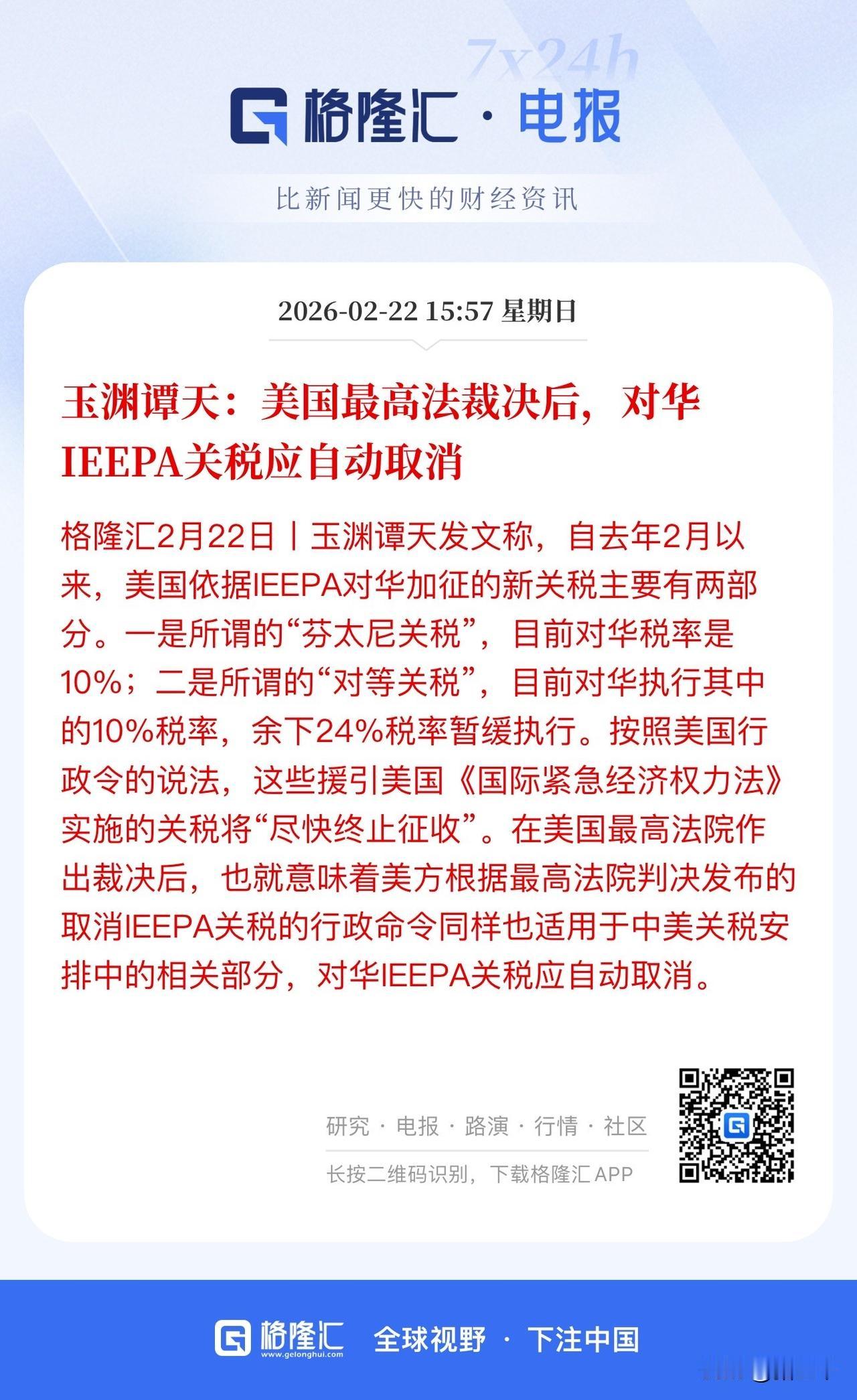 美国关税大裁决的变局下, 给白宫提供了一次压力测试的机会。 测试同盟的忠诚度, 日韩表决心坚定不移对美投资。 IEEPA是关税核武器, 最高法院废掉了如指臂使的工具。 白宫另辟蹊径援引1974关税法案, 该合约条款每个效用期是150天。 这一下子解释了白宫急于组建和平委员会的原因,未来新的同盟盟约可以固化关税税率,绕过1974旧条约和最高法院的掣肘! 最高法院一锤定音下, 奈飞等大企业、几个州都开始向白宫索偿。 现在全世界都开始看龙国的态度, 东大也没让大家失望, 玉渊潭天发声: 美国最高法裁决后,对华IEEPA关税应自动取消! …
