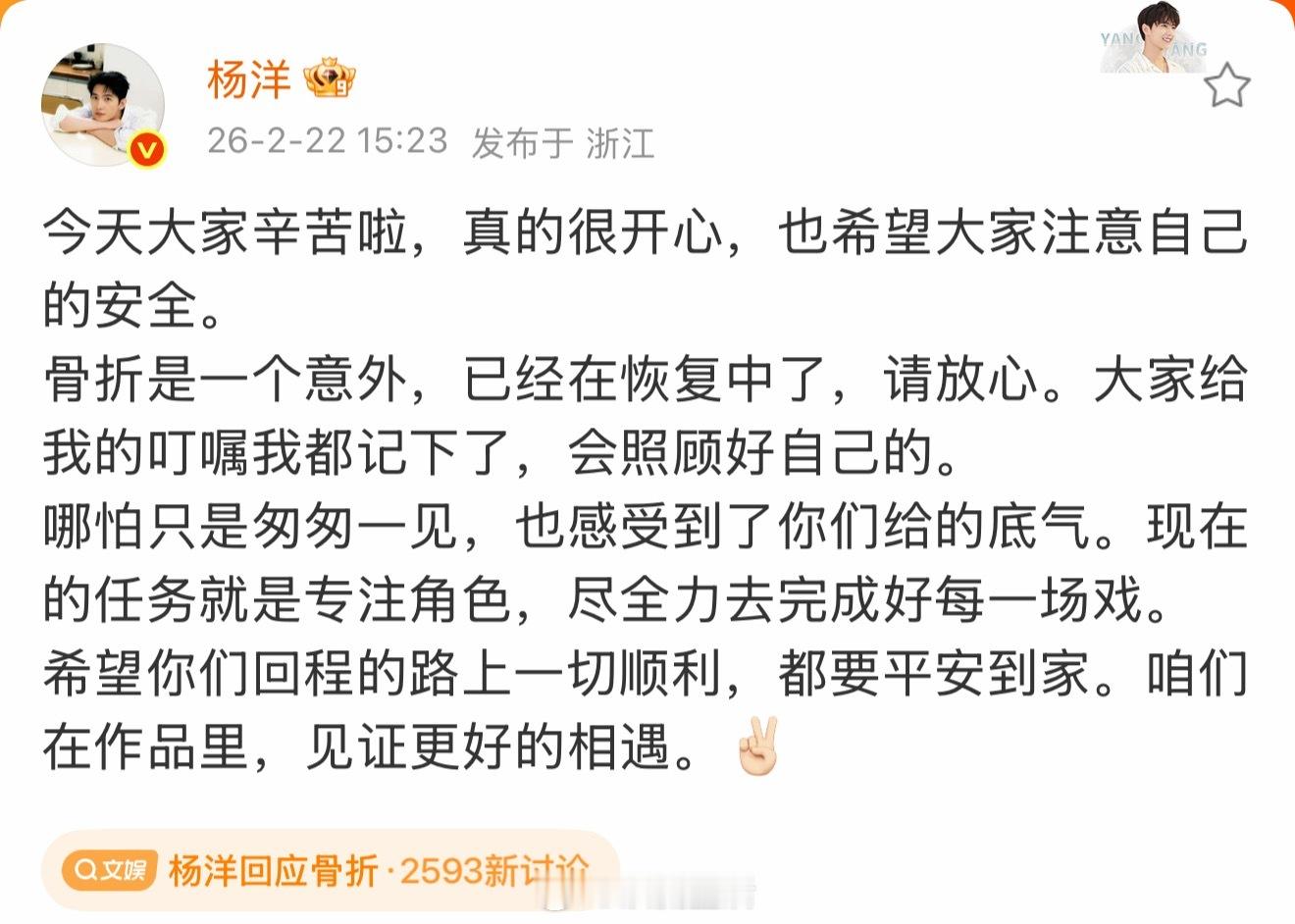 杨洋发文让粉丝放心,会记住大家的叮嘱照顾好自己。很开心有这么多粉丝来到现场,提醒大家回程注意安全。他真的好温暖呀。