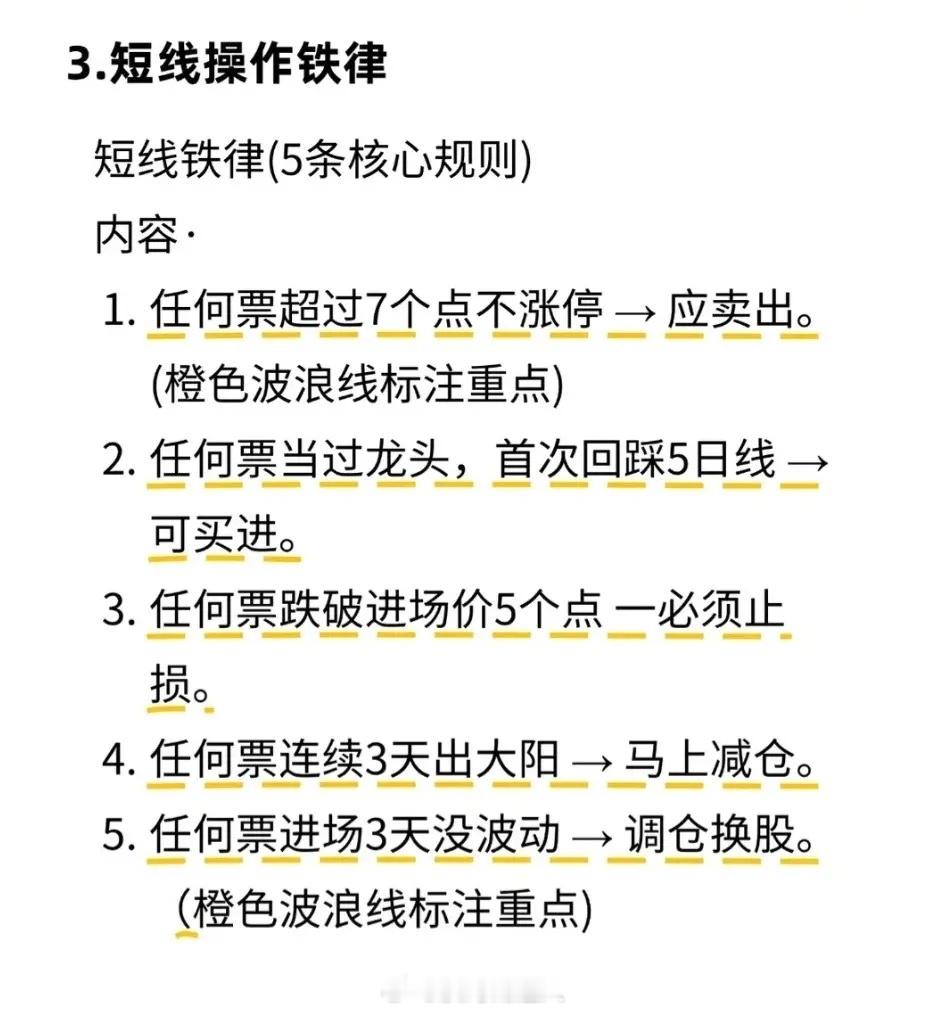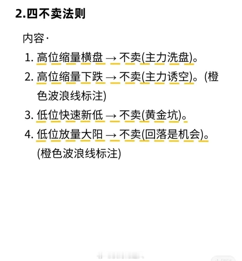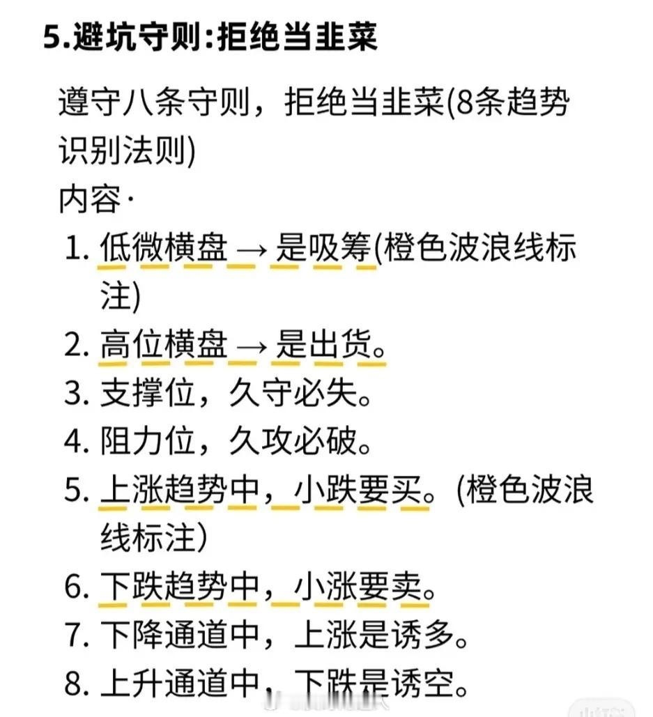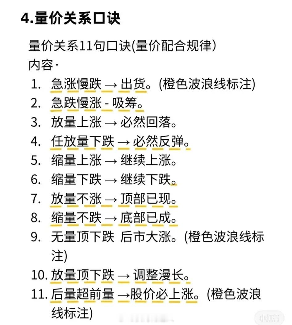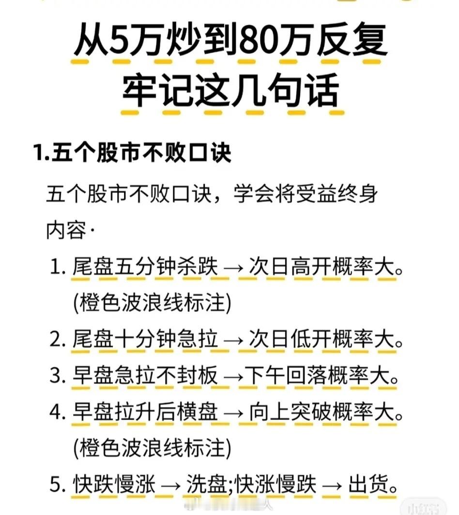 1. 五句不败口诀:尾盘杀跌次日易高开;尾盘急拉次日易低开;早盘急拉不封板午后易回落;早盘拉升横盘易向上突破;快跌慢涨是洗盘,快涨慢跌是出货。2. 四不卖法则:高位缩量横盘/下跌不卖(洗盘/诱空);低位快速新低/放量大阳不卖(黄金坑/机会)。3. 短线铁律:超7点不涨停卖出;龙头首踩5日线买进;跌破成本5点止损;连3天大阳减仓;进场3天无波动换股。4. 量价口诀:急涨慢跌出货;急跌慢涨吸筹;放量涨必回落;缩量涨续涨;无量顶跌后市大涨;后量超前量必涨等。5. 避坑守则:低位横盘吸筹;高位横盘出货;支撑久守失、阻力久攻破;上涨小跌买、下跌小涨卖;下降通道涨诱多、上升通道跌诱空。