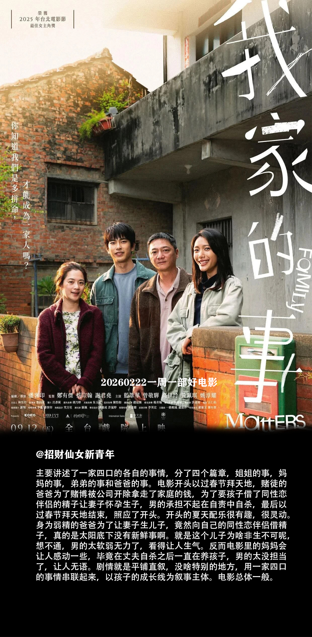 电影整体拍得平淡,虽说很像无数个东亚家庭现状,但似乎缺了一些往更深处挖掘的锐度。可看,看完继续在吵吵嚷嚷中祈求家人平安快乐。一周一部好电影春节档马上有戏