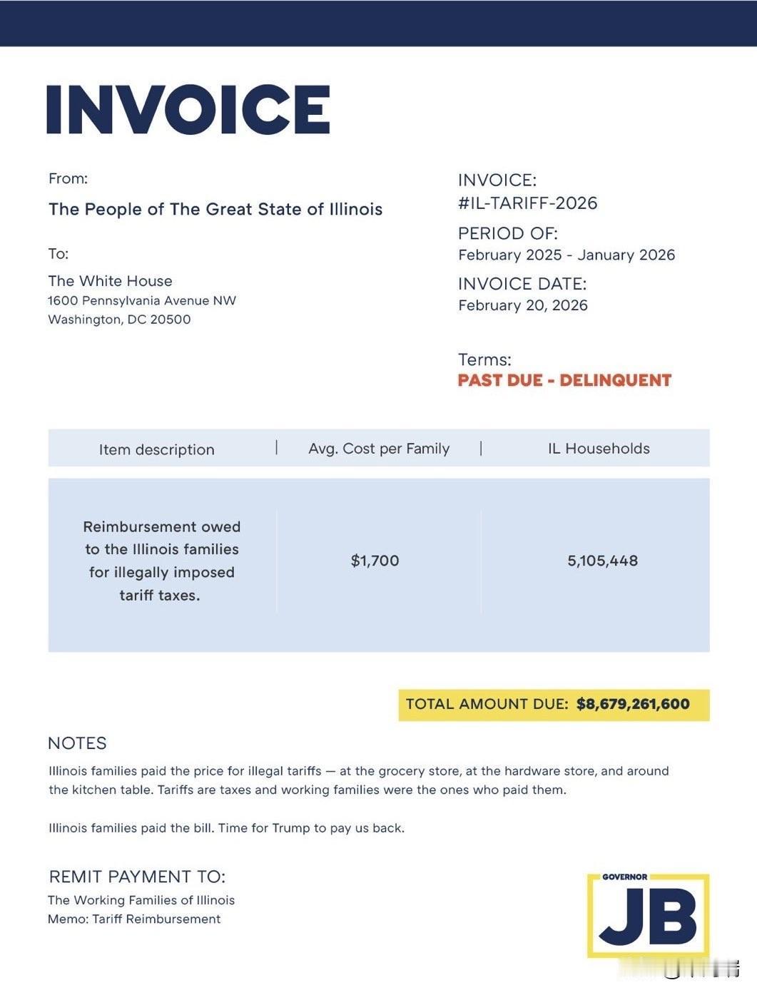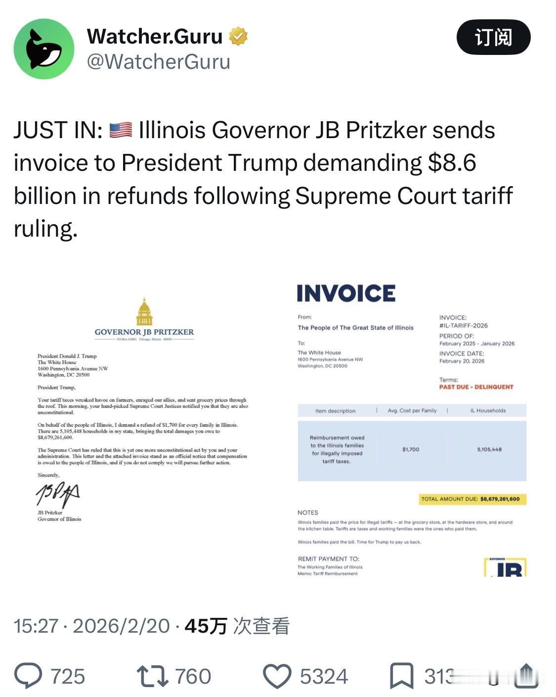 2026 年 2 月 20 日,伊利诺伊州州长 普利茨克正式向特朗普总统发出了一封信函及一份标记为“逾期未付(Past Due – Delinquent)”的账单,要求联邦政府向该州居民退还 86.8 亿美元的关税。 以下是该事件的核心详情: 起因: 此前,美国最高法院以 6 比 3 的投票结果裁定,特朗普援引 1977 年《国际紧急经济权力法》(IEEPA)征收的全球关税超出了总统职权范围,属于违宪。 账单金额: 普利茨克州长指出,这些关税导致伊利诺伊州约 510 万个家庭平均每户损失了 1,700 美元,总计约 86.8 亿美元。 州长的态度: 普利茨克在信中直言这些关税“掠夺了伊利诺伊州家庭”,导致生活成本和食品价格飙升。他警告称,如果白宫不支付这笔退款,伊利诺伊州将采取进一步法律行动。 特朗普的回应: 特朗普对最高法院的裁决表示愤慨,并随即宣布了一项“备用方案”,即根据 1974 年《贸易法》征收为期 150 天的临时 10% 全球关税。 此次行动被视为普利茨克(被认为是 2028 年大选的潜在竞争者)与特朗普政府之间激烈政治与法律对抗的最新升级。