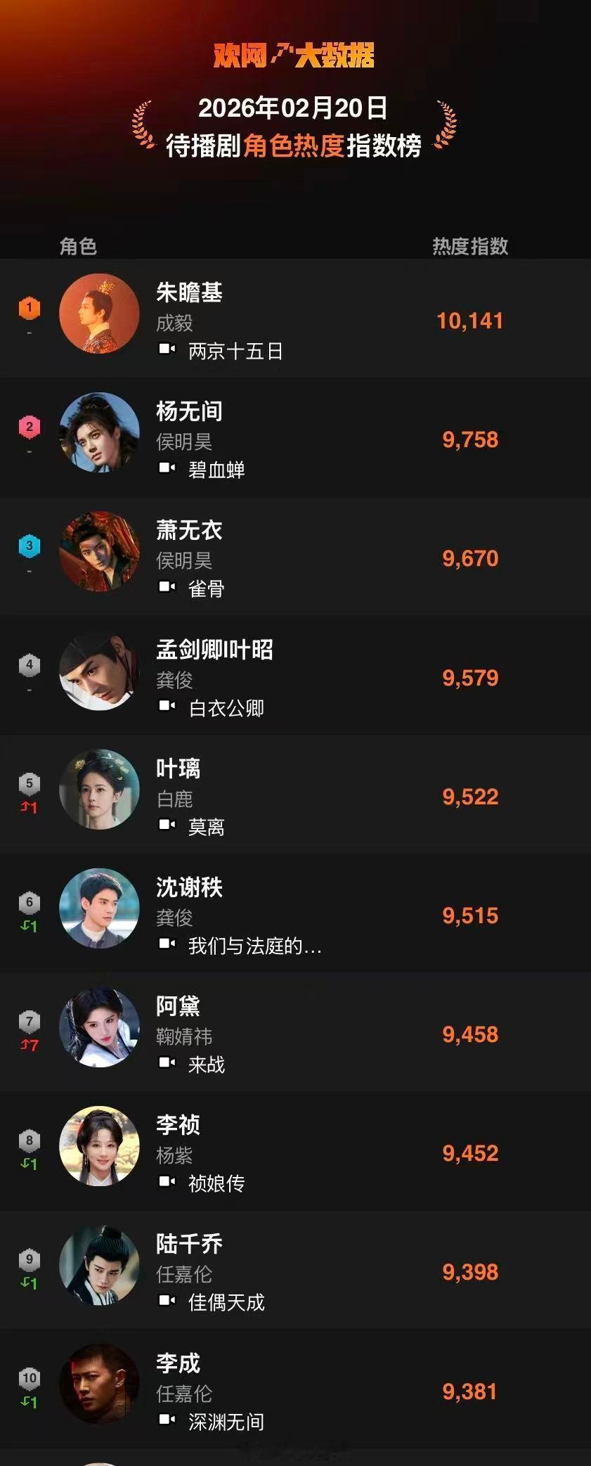 欢网大数据日榜:待播剧角色成毅朱瞻基,角色热度破万登顶!