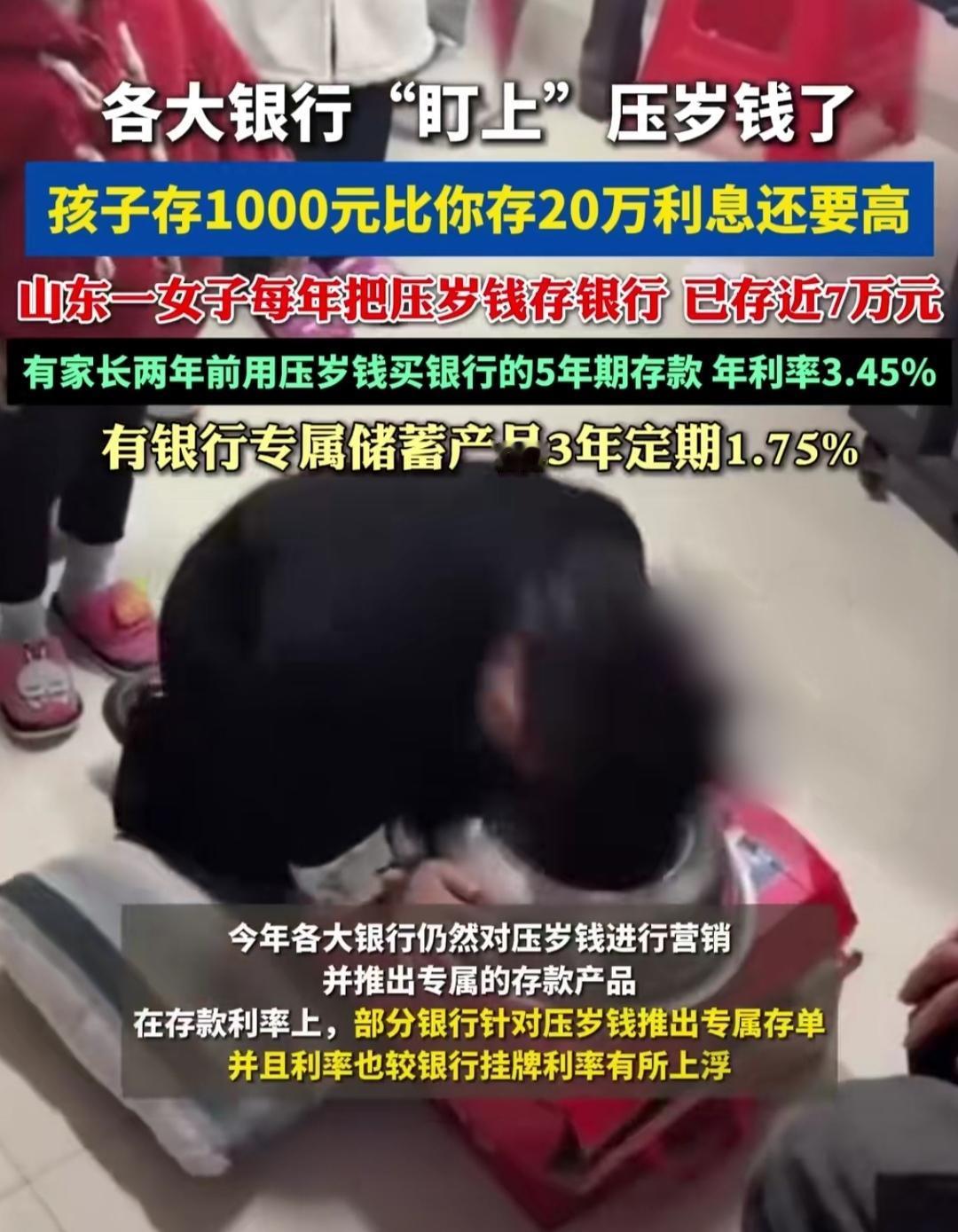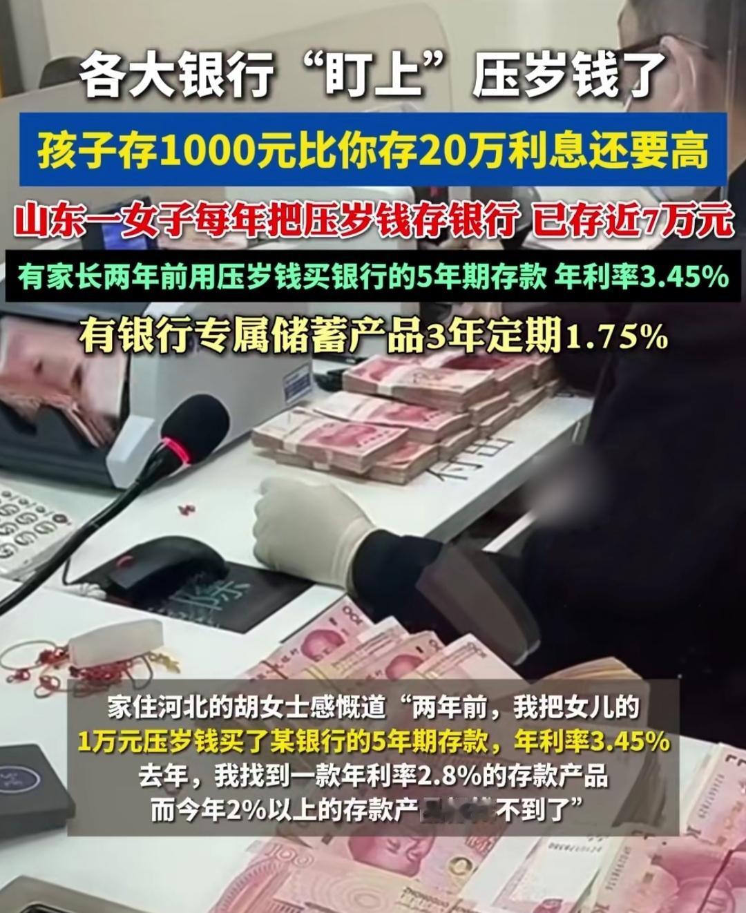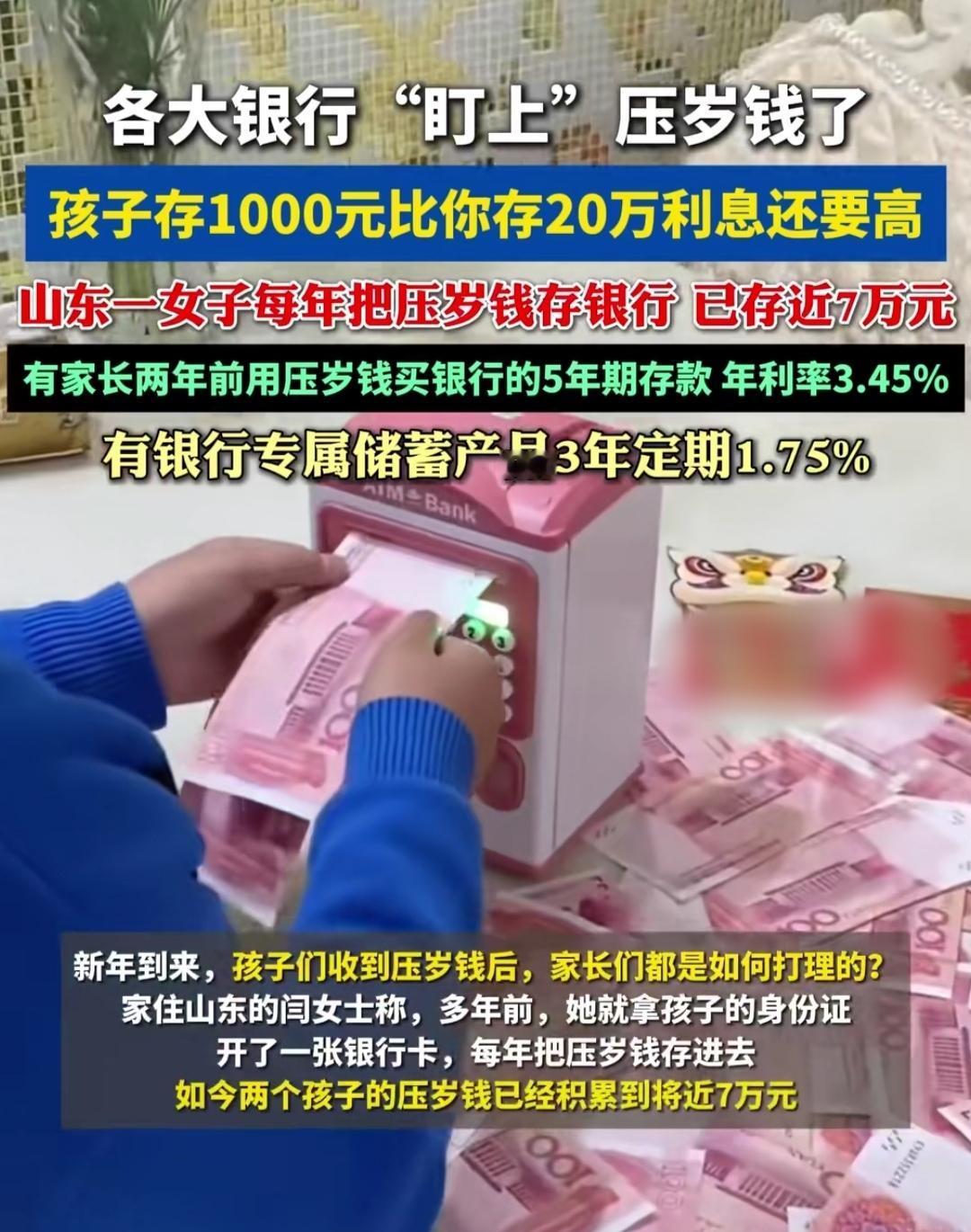 万万没想到,这年头连存钱都开始“拼身份”了!孩子账户里存1000块的利息,竟然能跑赢大人的20万存款。这则刷屏的消息,让不少网友直呼“扎心”,也解锁了压岁钱的全新打开方式。 山东闫女士的操作堪称教科书,她用孩子的身份证开了专属账户,每年把压岁钱按时存入。日积月累,两个孩子的“小金库”居然攒到了近7万元,靠的就是儿童存款高出成人定存的利率优势。 原来这是银行推出的儿童专属产品,门槛不高还能亲子共管。看着数字慢慢增长,不仅守住了压岁钱,更给孩子上了一堂生动的财商课。关于怎么打理孩子的“第一桶金”,你心里有答案了吗?