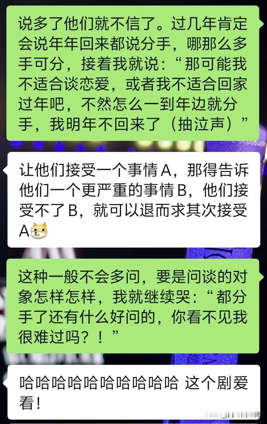 今年的催婚战到此结束 除夕前一天回家,当晚被拉去拜访亲戚,说适婚年龄可以谈个对象结婚了,我用网上的反催婚战术回怼:“着急的话可以先随礼。” 凝固的空气充斥着尬味儿。 停顿片刻后,我继续道:“也可以给我介绍,我要身高2米长相帅气年收入百万以上且愿意分我一半的。” 我妈说想得真美,不如回家洗洗睡,梦里啥都有。我说坐了一天车还真困了,这就回去。丢下几句客套话后转身离开,屋内人面面相觑(也许吧,我没回头)。 昨天下午,刚结婚不久的表姐带着她老公和一家人到我家喝茶,聊着聊着,表姐她妈妈(也就是我姑姑)转头问我谈恋爱了没。 我瞅着大我两岁的表姐,迟疑片刻,正准备开口编故事,表姐抢先替我接了她妈的话:“你咋这么八卦,人家谈不谈和你有啥关系,该让你知道时你自然会知道,有啥好问的。” 姑姑:“过年关心一下不行啊?” 我爸妈在一旁附和着笑了笑,我依旧不答话。表姐继续替我接:“但你这样直接问我们年轻人隐私不礼貌,大过年的你咋不多关心关心刚回家的我和你女婿。” “得得得,说不过你,不问了。”姑姑消言。 我在微信上给表姐连发了三个👍🏻。毕竟在场只有她知道、尊重、支持我不婚不育且厌男。要是每场催婚战都有她这种mvp站出来让我当躺赢狗就好咯 今晚,外婆和大姨一家来我家吃饭,不出意外,外婆的八卦之心果然几年如一日地熊熊燃烧,饭后饮茶时又开始问我感情状况。我为此准备的剧本终于派上了用场(如图)