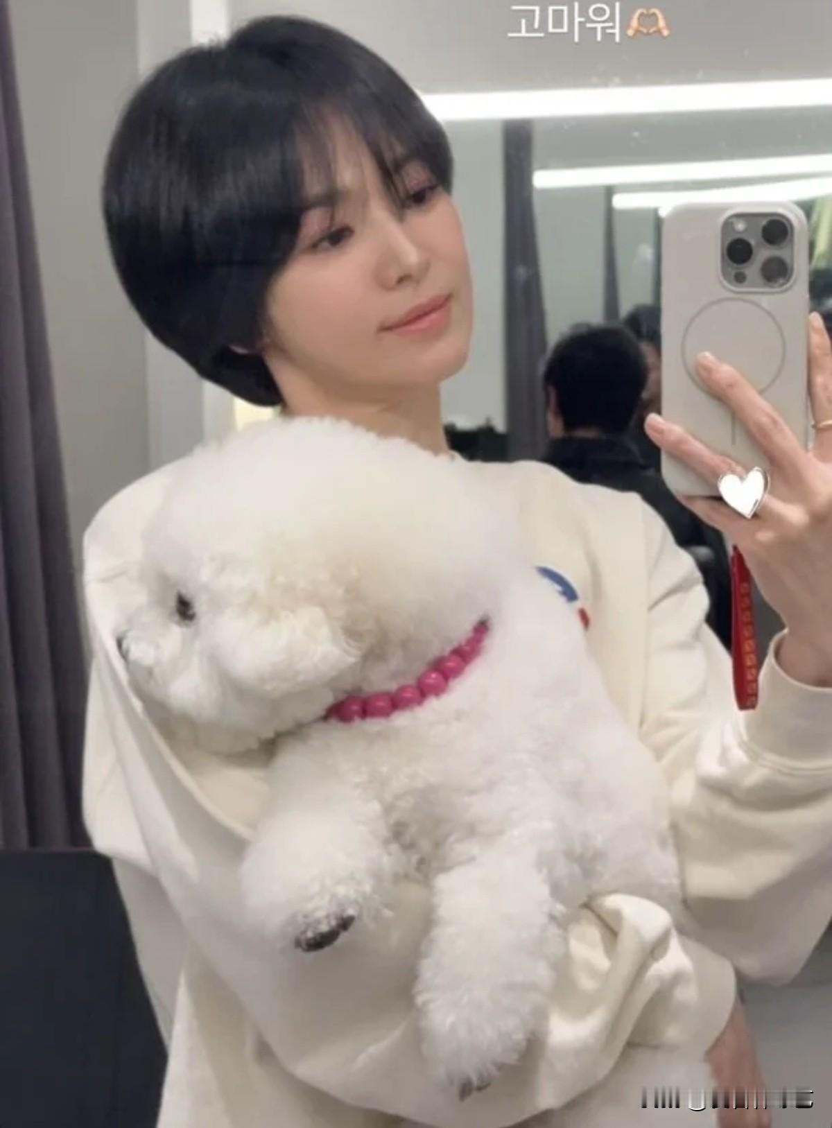 20日,演绎宋慧乔在个人Instagram上传也自拍照,并写道“妆容由艺恩打造,谢谢。” 公开的照片中,宋慧乔抱着爱犬Ruby对着镜子自拍。她一头利落的短发搭配象牙色系的男士套装,营造出轻松舒适的氛围,淡淡的粉色妆容更凸显了她明艳动人的气质。