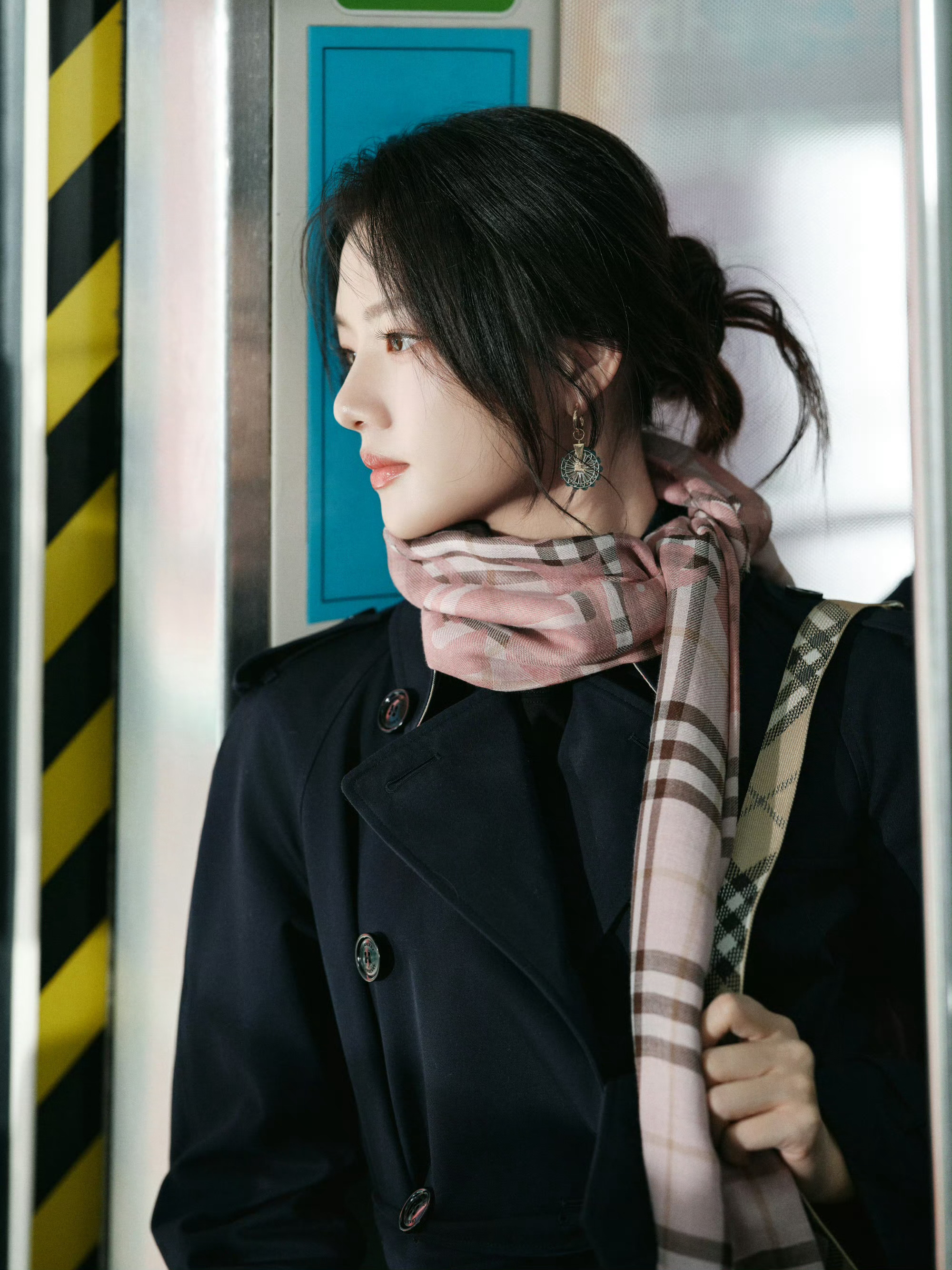 任敏机场出发造型,大衣搭配粉色格纹围巾。状态满分!满满元气!