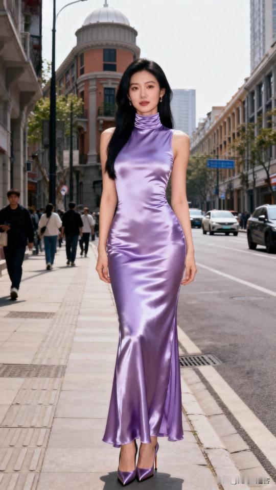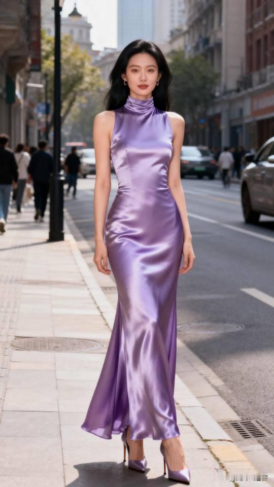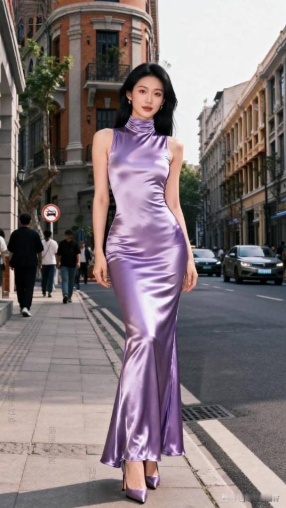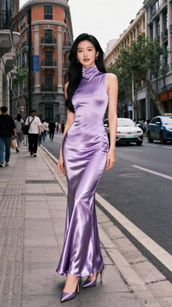 都市街头,紫色丝绒长裙美女,气质优雅。旗袍裙连衣长裙礼服长裙气质美女