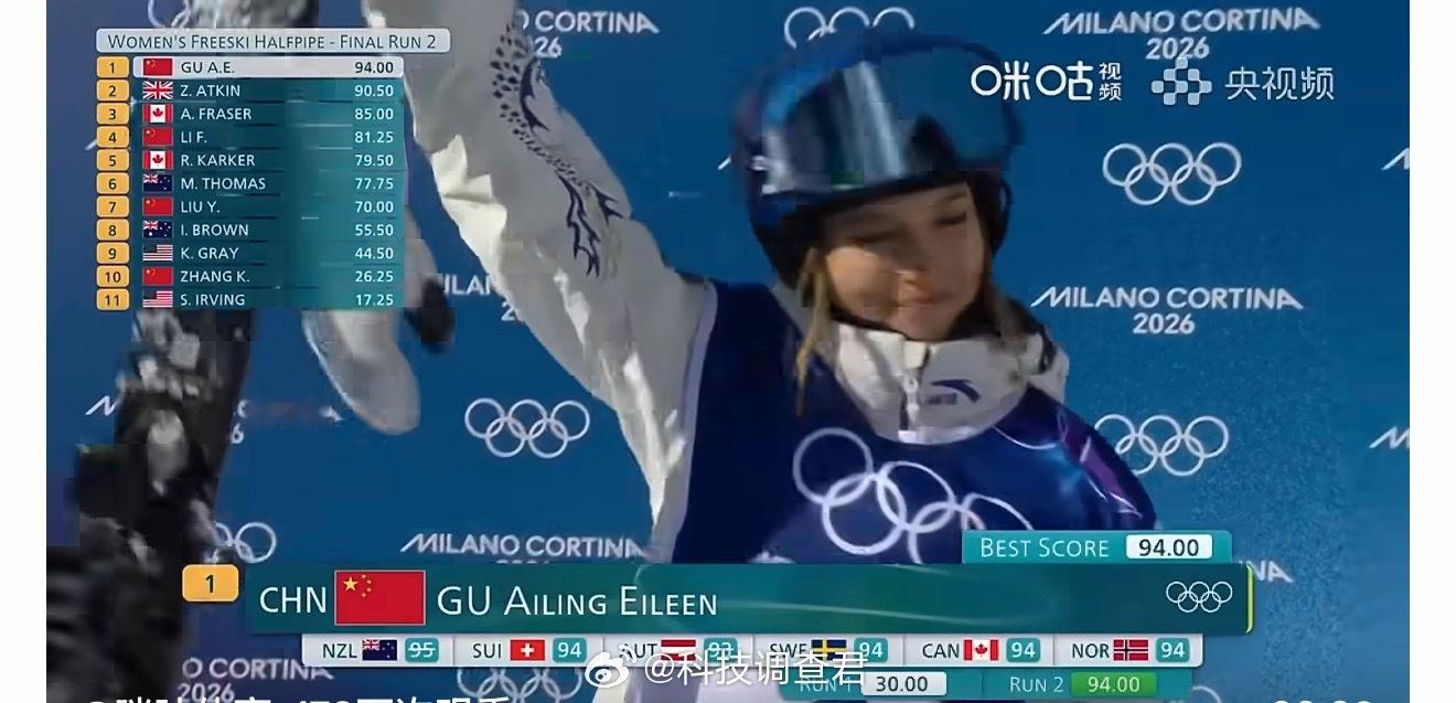 谷爱凌第二滑94.00分看完了很精彩,恭喜恭喜~
