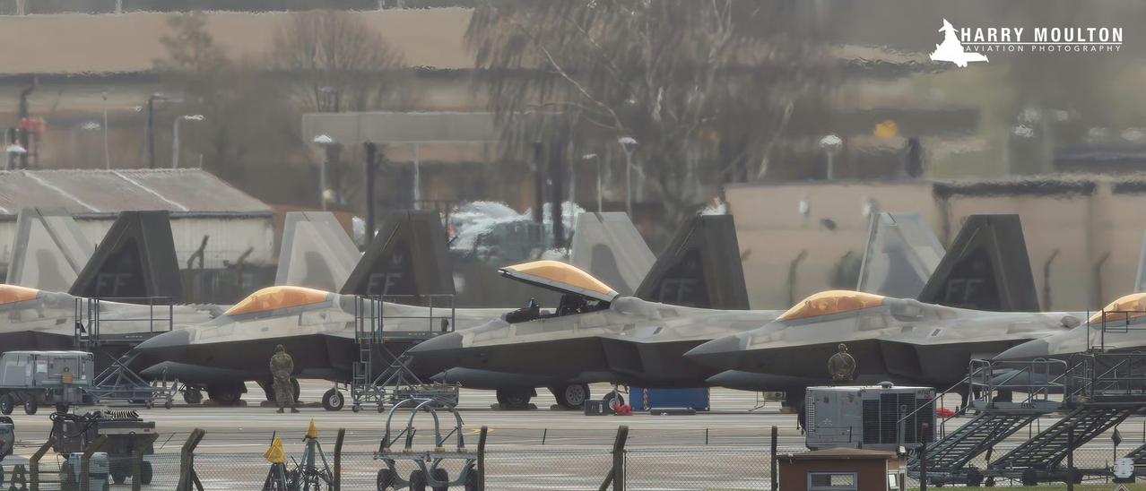 当地时间2月21号,美国空军第1战斗机联队的12架F-22战斗机被发现停在英国莱肯希斯空军基地。