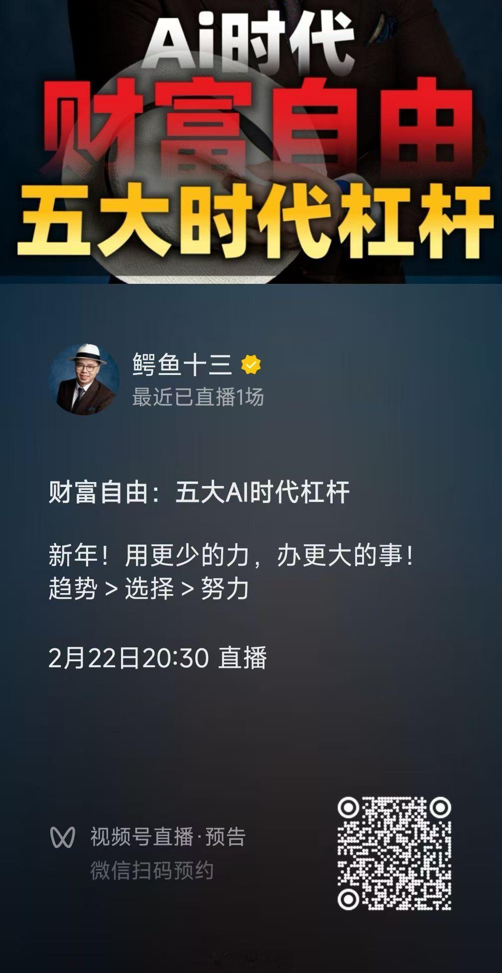 a股 今晚8点半,初六直播聊天每一次,有一个观点启发你就够了。财富自由:五大AI时代杠杆 新年!一起用更少的力,办更大的事