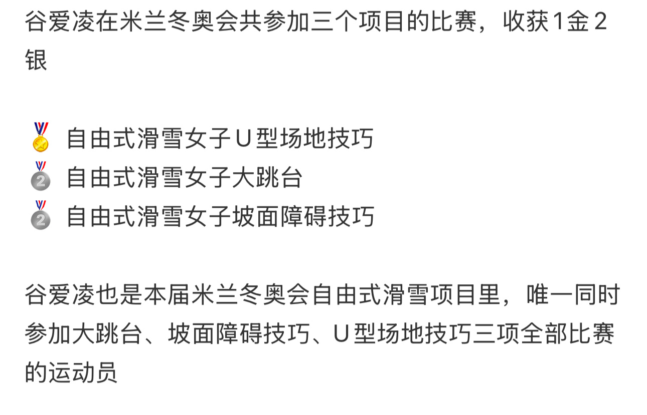 谷爱凌在米兰冬奥会共参加三个项目的比赛,收获1金2银,刷新了多项记录