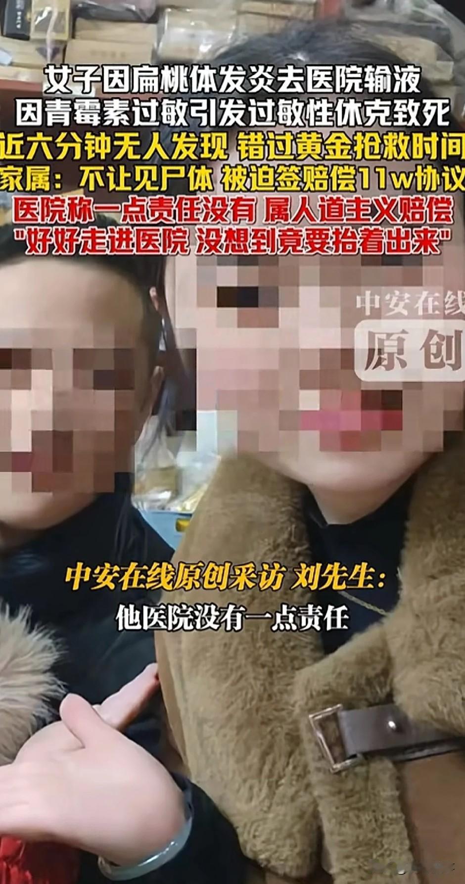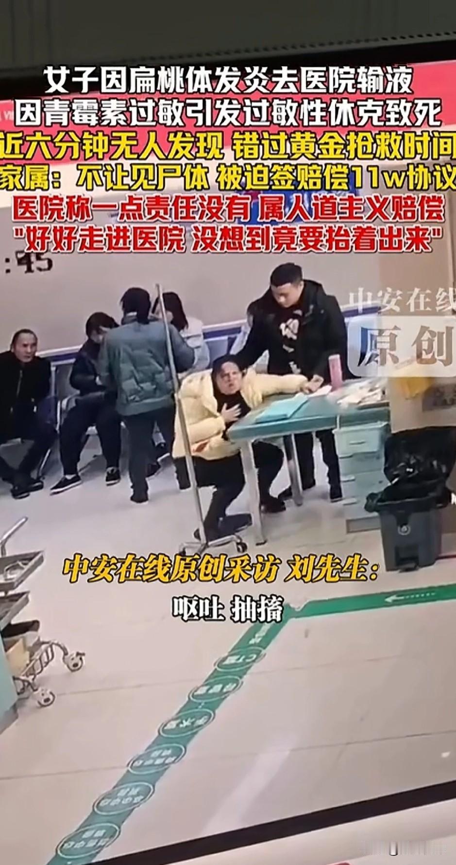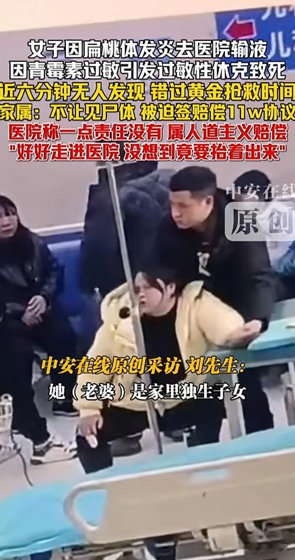 “这是天使还是魔鬼?”湖南益阳发生了一件让人痛心的事,一女子因为扁桃体发炎,在丈夫陪同下去医院输液,没想到仅仅过了几秒钟就出现了严重的过敏反应,最终失去了生命。更让丈夫难以接受的是,医院最后竟声称,女子的死亡是患者自己过敏导致死亡,和医院没有关系。 据了解,这名女子前几天因嗓子疼得厉害,吃饭喝水都很困难,丈夫看着心疼妻子,便赶紧陪她到医院看病。 经排队挂号、医生检查后,医生直接开了输液的药,是头孢曲松。 然而,整个过程中,医生没有问过女子有没有药物过敏史,也没有按照规定做皮试,就直接让护士配药输液了。 岂料,药水刚输进去几秒钟,女子突然脸色发白,胸闷想吐,浑身难受。 丈夫一看就知道是药物过敏,马上大声喊医护人员过来帮忙。他当时还觉得,在医院里,只要及时处理,肯定能救回来。 可让他没想到的是,喊了半天都没人重视。一名护士过来看了一眼就走了,一个护工也只是简单查看一下就离开了。 宝贵的黄金抢救时间,就这样被白白耽误。 等丈夫急得拼命大喊,医护人员才慢慢推来担架,可此时女子已经浑身发软,失去了自主行动的能力,最佳抢救时机早就错过了。 送到抢救室后,医生最终宣布抢救无效,人已经不在了。 丈夫当场崩溃,妻子只是一个小小的扁桃体发炎,怎么可能说没就没。临走前,妻子还在担心家里的孩子,如今却永远回不来了。 据了解,这位女子还是独生女,父母均为残疾人,如今女子离世,根本没法和家里的父母交代。 更让丈夫无法接受的是,医院不仅不让他见妻子最后一面,还拿出协议,提出只赔偿11万元,想让他签字私了。 丈夫在极度悲伤的情况下,被迫引导签下了协议。 就在这之后,面对家属的质疑,医院竟坚持称,是患者自己过敏导致死亡,和医院没有关系。 丈夫彻底愤怒了,他当场拒绝赔偿,表明自己即便不要钱,也让医院给个说法。 这件事传开后,很多网友都表示同情和气愤。 网友们纷纷认为,头孢类药物必须皮试是基本常识。然而,这家医院用药却不查过敏、不做皮试,过敏后不及时抢救,这些明显的失误,医院却全程推卸责任,视而不见,医院明显违规操作,才酿成了这样的悲剧,11万根本无法弥补一个家庭的损失。 从法律角度来看,医院的这些“骚操作”明显存在着过错,且该过错与妻子的死亡结果之间存在明显的因果关系,医院应当要承担侵权责任。 即便医院提出11万元赔偿,也只能算作人道主义补偿,不能免除其应承担的法律责任。 如果医院拒绝担责,丈夫及家属完全可以在收集相关证据的情况下,进而通过诉讼方式,要求医院承担相应的赔偿责任。 总之,医院本是守护生命的最后防线,可当就医流程形同虚设、责任抛之脑后、生命被轻贱对待时,再权威的机构,也失去了本该有的温度。 一条年轻生命的逝去,也给所有家庭和医疗行业都敲响了警钟:就医时务必确认用药安全,而医疗从业者,更要守住敬畏生命的底线。 对此,你怎么看?欢迎大家在评论区留言。