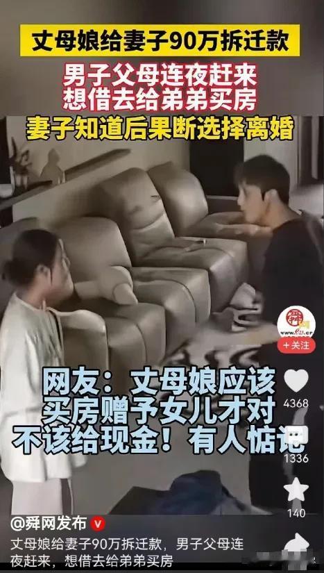 人间清醒!2月9日,安徽,女子娘家拆迁,娘家父母给女子分了90万拆迁款,谁知道钱还没捂热,公婆知道了,老两口连夜赶过来,想找女子借钱给他们的小儿子买房。女子不可置信,当即决定离婚走人! 2月9日,安徽,一笔90万的拆迁款,让一场婚姻走到了尽头。这件事在社交平台上迅速发酵,网友们纷纷为女子的“人间清醒”点赞,也引发了关于婚姻边界感和原生家庭扶持的热烈讨论。 当天下午,女子刚从娘家回来,随身的银行卡里躺着父母刚转来的90万拆迁补偿款。娘家老宅拆迁,父母念及她远嫁不易,特意在补偿款里单独给她分了一份,既是对她的疼爱,也是给她留的一份底气和后路。 女子握着银行卡,心里满是暖意,还在琢磨着这笔钱该如何规划,是提前还一部分房贷,还是存起来作为家庭应急资金。 她只是在晚饭时随口和丈夫提了一句娘家拆迁分钱的事,并没有细说具体数额。可谁也没想到,消息像长了翅膀一样,当晚就传到了公婆的耳朵里。 深夜十一点多,女子和丈夫正准备休息,门外突然传来急促的敲门声。打开门一看,公婆两人裹着夜色,带着一身寒气站在门口,连鞋都没换,就径直走进了客厅。 老两口脸上没有丝毫深夜到访的歉意,眼神在屋里四处打量,直奔主题。他们的小儿子近期准备买房,首付还差一大截, 得知儿媳手里有拆迁款,老两口连夜赶过来,就是想让她把这笔钱拿出来“借”给小叔子。在他们的语气里,这件事仿佛理所当然,没有商量的余地,甚至连一张借条都没打算提。 女子当场愣住,随后涌上的是难以言喻的震惊和心寒。这笔钱是父母给她的个人财产,并非夫妻共同财产,公婆却想凭着一句“一家人”,就轻易拿走她的全部底气。 她看向身旁的丈夫,希望能得到一丝支持,可丈夫却低着头,手指抠着沙发缝,始终不敢与她对视,只是含糊地劝她“互相帮衬一下”,话里话外都是偏袒自己的父母和弟弟。 丈夫的沉默,成了压垮骆驼的最后一根稻草。女子瞬间清醒,她意识到,在这个家里,自己始终是个外人,丈夫从未真正站在她的角度考虑问题。 多年来,她对公婆孝顺,对小叔子也多有帮衬,可她的付出,在公婆的偏心面前,显得一文不值。 没有争吵,也没有哭闹,女子的态度异常坚定。她当即做出了离婚的决定,转身走进卧室,开始收拾自己的随身物品。 公婆见状,这才慌了神,一边阻拦一边劝说,丈夫也急得连连道歉,承诺不再提借钱的事,但女子心意已决。 她拿着自己的东西,头也不回地走出了这个生活了多年的家,第二天一早就向法院提交了离婚申请。 女子的经历被朋友发到网上后,很快引发了轩然大波,相关话题迅速登上热搜。网友们的评论一边倒,几乎都在支持女子的决定。 有网友表示,90万不仅是拆迁款,更是照妖镜,照出了婆家的贪婪和丈夫的软弱;还有网友感慨,婚姻里最可怕的不是贫穷,而是遇事时伴侣的缺位,女子的及时止损,是对自己最好的保护。 也有网友结合法律知识留言,根据相关规定,父母自愿赠与女儿的拆迁款,属于个人财产,女子有权拒绝任何形式的索取。 大家纷纷表示,亲兄弟明算账,即便是亲人,也该有基本的边界感,不能用亲情绑架,无限度地牺牲一方的利益,去补贴另一方。 对此,你们有什么看法,欢迎评论留言~