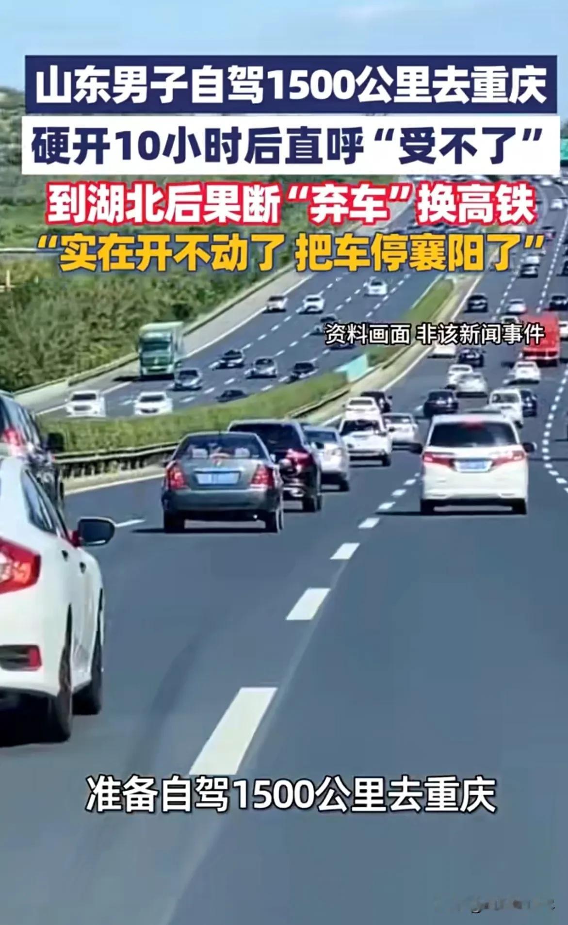 春节自驾的崩溃,被一位山东大哥演到了极致。计划1500公里直达重庆,满怀憧憬上路,却在春运车流里硬熬10小时,开到湖北襄阳时,身体彻底报警。他果断把车停好,转身冲进高铁站,一句“实在开不动了”,戳中千万网友的破防瞬间。 春节假期的长途自驾,成了不少人出行体验的真实写照,一段山东男子自驾中途弃车换乘高铁的视频,在网络上快速刷屏,戳中了无数春运出行者的内心。 2026年2月20日,山东泰安的一位男子规划了春节自驾出行行程,目的地为重庆,全程接近1500公里,出发前他做好了详细路线规划,满心期待着一路顺畅抵达,开启愉快的旅途。 男子清晨从家中出发,驾车驶入高速路网,原本预想的轻松行驶,很快被春运的密集车流打破。 沿途主干高速路段车流饱和,频繁出现缓行与拥堵,他只能在车流里慢慢挪动,精神时刻保持高度紧张,不敢有丝毫松懈。 行驶途中,服务区内人满为患,停车、如厕、补给都需要排队等候,他只能短暂停留,简单休整后便继续上路,全程没有充足的休息时间。 就这样在高速上持续行驶了10个小时,男子驾车抵达湖北襄阳境内,此时他仅完成了一半左右的行程,身体与精神都到达了极限。 长时间保持固定驾驶姿势,腰背出现明显酸痛,眼睛因长时间注视路面变得干涩不适,反应速度也逐渐变慢,身体发出明确的疲劳信号。 面对剩余的漫长路程和依旧看不到头的车流,他没有纠结于已经付出的时间与成本,也没有纠结于既定的自驾计划,当即做出了换乘的决定。 男子将车辆妥善停放在襄阳的停车区域,整理好随身物品后,直接前往高铁站办理购票手续,选择乘坐高铁继续前往重庆。 这一果断的举动,没有丝毫犹豫,也没有被“来都来了”的固有想法束缚,完全遵从身体的真实感受,放弃疲劳驾驶,选择更安全舒适的出行方式。 这段真实的出行经历被分享到网络后,迅速引发大量网友的共鸣,很多有过春运长途自驾经历的网友,都从这段经历里看到了自己的影子。 大家纷纷分享自己的春运出行故事,讲述长途驾驶的疲惫与无奈,也对男子及时止损的做法表示认同。 春运期间的跨区域出行,本是为了奔赴美好旅途,安全与舒适始终是出行的核心,根据实际情况灵活调整出行方式,远比硬撑着疲劳驾驶更理性。 这场半路换乘的小插曲,没有戏剧性的冲突,却真实还原了春运自驾的普遍状态,也让更多人看到,出行不必执着于固定方式,懂得照顾自己的身体、及时调整规划,才是对旅途最负责的态度。 对此,你们有什么看法,欢迎评论留言~