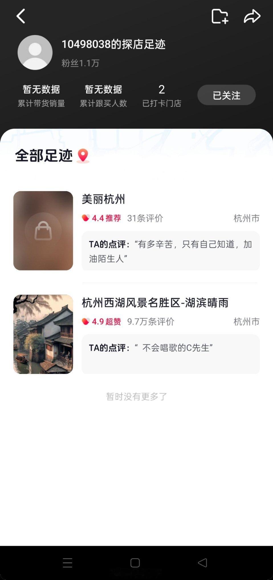 4、她这个账号还有俩探店足迹,这俩店都在杭州,但是不清楚点评时间……曲婉婷